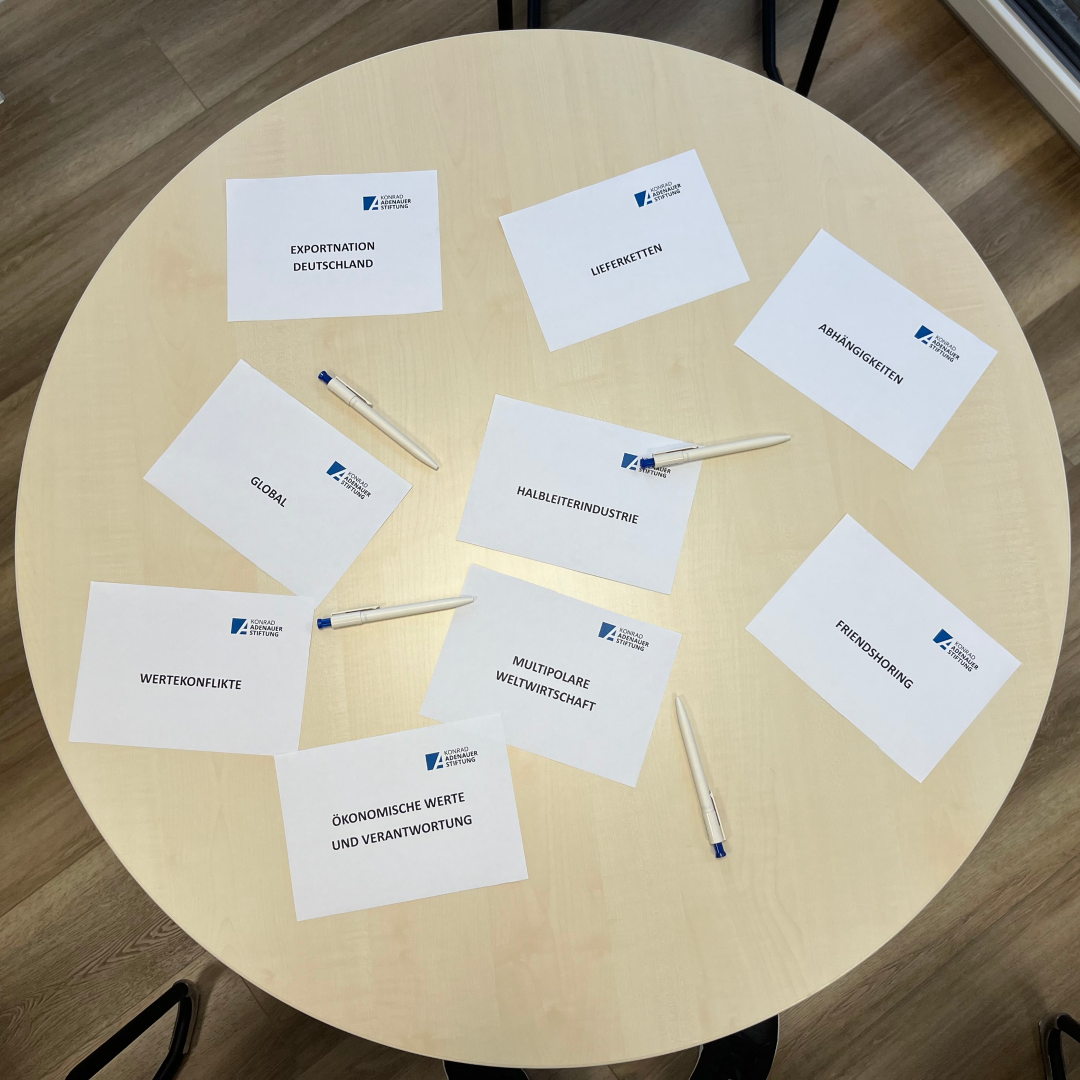 Nachdem von den Schülerinnen und Schülern Nachfragen gestellt worden waren, wurden diese in Arbeitsgruppen aufgeteilt, in denen sie wirtschaftliche Vor- bzw. Nachteile herausarbeiten sollten, die sich durch eine aktivere deutsche Rolle oder Einflussnahme in diesem Konflikt ergeben würden. Die Basis dafür bot nicht nur der Vortrag, sondern auch mehrere Begriffskarten wie „multipolare Weltwirtschaft“ oder „Halbleiterindustrie“.