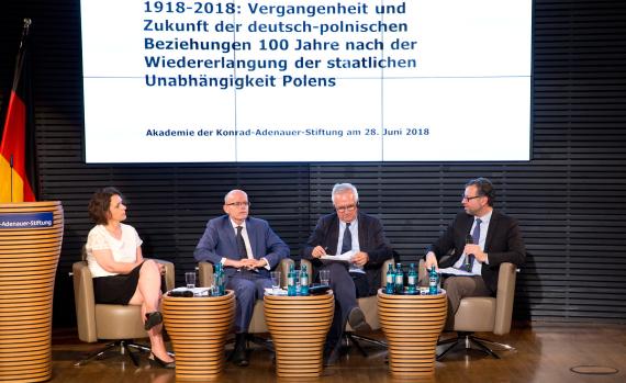 Im weiteren Verlauf der Veranstaltung nahmen Zbigniew Nosowski, Chefredakteur der kath. Monatszeitschrift Więź, Professor Stephan Lehnstaedt vom Touro College Berlin, Dr. Agnieszka Łada, Direktorin des Europa-Programms des Instituts für Öffentliche Angelegenheiten, sowie Dr. Justyna Schulz, Direktorin des West-Instituts Posen, einen Rückblick auf die letzten 100 Jahre der deutsch-polnischen Beziehungen vor. Im Fokus des zweiten Panels stand dann die Zukunft. Paul Ziemiak, Mitglied des Deutschen Bundestages, und Staatssekretär Paweł Szefernaker, Abgeordneter des Polnischen Sejm, diskutierten dabei u.a. über die Minderheitenpolitik, Energie- und Sicherheitsfragen sowie die Flüchtlingsproblematik.