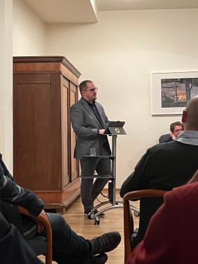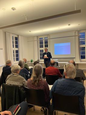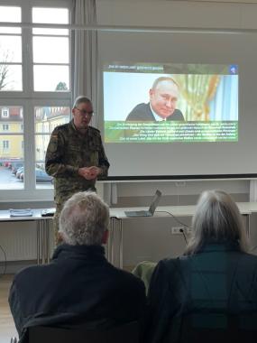 Den inhaltlichen Auftakt bildete der Vortrag von Militärdekan Dr. Dirck Ackermann (Evangelisches Kirchenamt für die Bundeswehr). Unter dem Leitmotiv „Friedenslogik und Sicherheitslogik zusammendenken“ machte er deutlich, dass sich kirchliche Friedensethik nicht von sicherheitspolitischen Realitäten distanziere, sondern diese weiterentwickle. Frieden sei ohne Sicherheit nicht denkbar, gleichzeitig müsse politisches Handeln stets der Herrschaft des Rechts folgen und nicht der Macht des Stärkeren. Die Aufgabe der Kirche für die Männer und Frauen in Uniform bestehe dabei nicht darin, einfache Gewissheiten zu liefern, sondern Gewissen zu bilden und differenzierte ethische Abwägungen der Einzelpersonen zu ermöglichen. Fragen wie Waffenlieferungen, nukleare Abschreckung oder internationale Kooperationen seien ethisch komplexe Abwägungsprozesse – einfache Antworten gebe es nicht. Ein gerechter und nachhaltiger Frieden lasse sich langfristig jedoch am besten innerhalb einer demokratischen Grundordnung verwirklichen, so Dr. Ackermann.