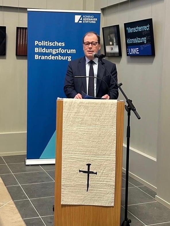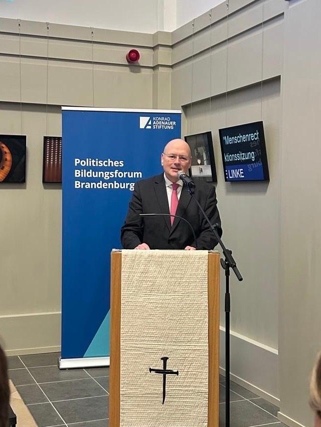 Vor dem Hintergrund der zunehmenden politischen Polarisierung erinnerte der Vorsitzende der CDU Brandenburg, Dr. Jan Redmann MdL, in seinem Grußwort an Schönbohms Fähigkeit, in die Mitte zu integrieren. Schönbohm, der die Brandenburger Politik über viele Jahre als stellvertretender Ministerpräsident und Innenminister prägte, galt als Bestandsgarant der Großen Koalition. Diesen „Geist der Zusammenarbeit“ wolle Redmann wieder erwecken. Was heute gebraucht werde, so Redmann, sei weniger Taktik und mehr Mut zur Entscheidung.