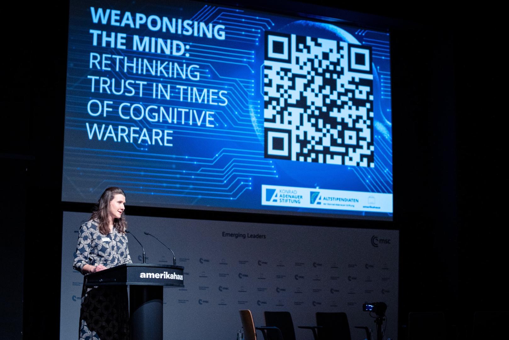 In ihrer Begrüßung machte Annegret Kramp-Karrenbauer, Vorsitzende der Konrad-Adenauer-Stiftung, deutlich, dass kognitive Kriegsführung alles andere als abstrakt ist: „Kognitive Kriegsführung hat längst begonnen. Sie unterscheidet nicht zwischen Friedens- oder Kriegszeiten und zielt sowohl auf das Militär als auch die Zivilgesellschaft ab.“ Für liberale Demokratien sei das eine besondere Herausforderung: „Wir müssen Antworten auf diese Art der Kriegsführung finden, ohne unsere demokratischen Prinzipien zu opfern.“