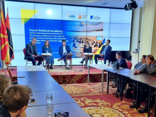 Afterwards a panel discussion was organized on the topic "The political, economic and energetic effects of the war in Ukraine on Europe". The speakers at this panel discussion were Gordana Dimitrieska Kochoska, Vice-President of VMRO-DPMNE and finance expert; Aleksandar Spasenovski, Professor at the Faculty of Law “Iustinianus Primus” – Skopje and former MP; Elena Markova Velinova, Expert in the field of energetics, as well as Ivan Botoucharov, Secretary General of EDS. The panellists addressed the effects of the war in Ukraine in their areas of expertise.
