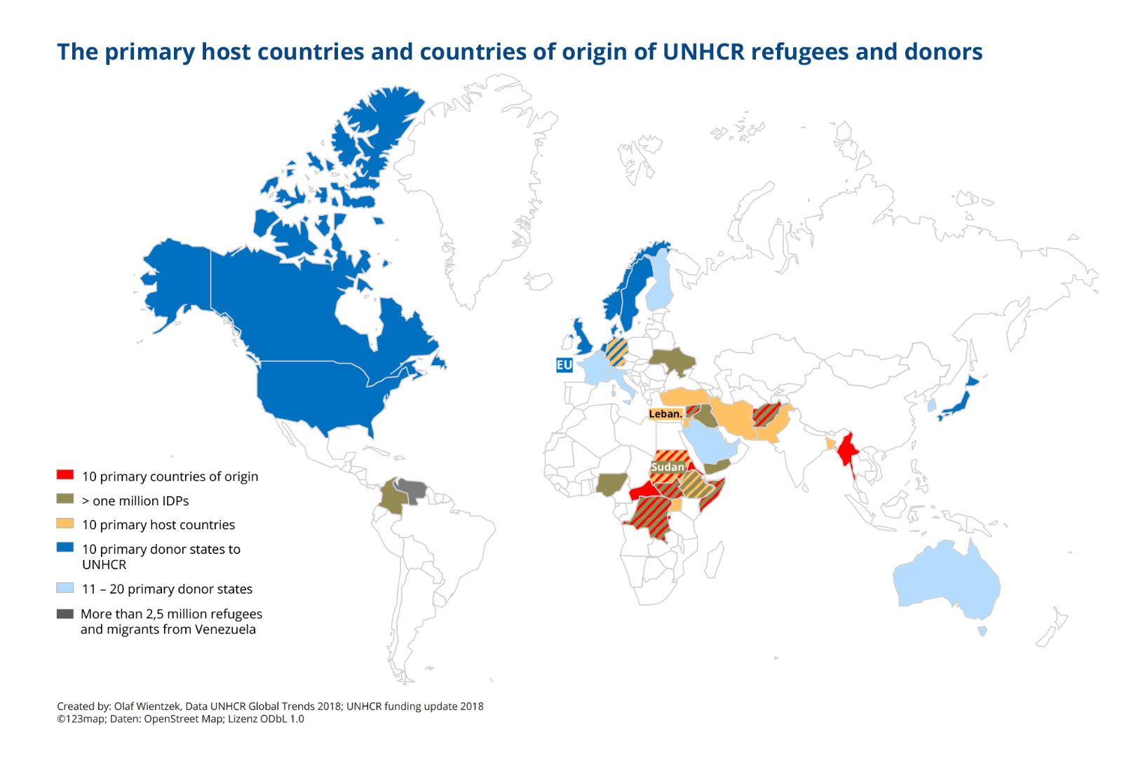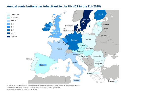 10. Solidarity has much room to grow: The commitment in regard to resettlement and humanitarian reception of recognized refugees (29 states offered 81,000 slots) does not nearly satisfy the demand of 1.4 million places. UNHCR’s financial requirements are only covered by 57%. 86% of the promised funds come from national governments and the EU, the financial burden is not distributed equally. In fact, 87.7% of all funds are attributed to the ten largest donors. The US, even under the Trump administration, remains the largest donor by a wide margin; the EU and Germany follow in second and third place respectively. The US’ financial contributions are approximately as high as those of the following nine state donors, including the EU. Norway, Denmark, Luxemburg and the Vatican are the most committed donors taking per capita contributions into account. Noteworthy: Germany is the only top ten host and donor country.