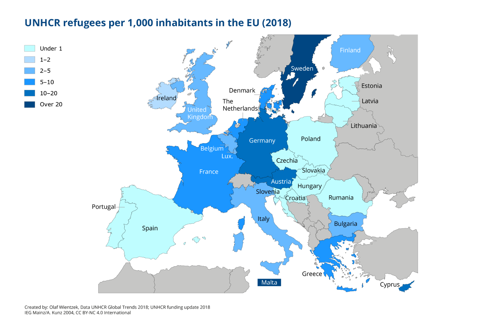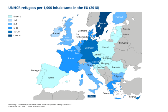 8. Is Germany the EU’s largest host country? – Yes and No: Germany is the world’s fifth largest host country with slightly over one million refugees. Thus, it is the largest EU host country by a wide margin. But that picture changes considering refugees per inhabitant. Sweden, Malta and Austria are most affected by that measure; Germany shares the fourth place with Cyprus