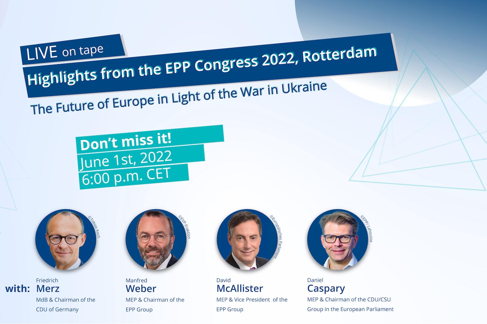 On the sidelines of the 2022 EPP (European People’s Party) Congress in Rotterdam, the Konrad Adenauer Foundation in Berlin and Brussels are offering a digital format "live-on-tape" ! It will be broadcast live on June 1st at 06:00 p.m. CET. Watch the highlights of the congress and interviews with high-level representatives on topics such as the war in Ukraine, the EU’s security policy, but also the particularities of the congress and the work of the EPP, as well as impressions of the two-day event in Rotterdam. Among others, you will hear from Ms Metsola (President of the European Parliament), Friedrich Merz, Manfred Weber, David McAllister and Daniel Caspary.