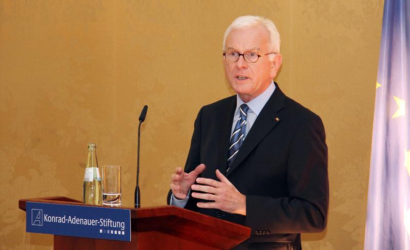 Der Vorsitzende der Konrad-Adenauer-Stiftung und ehemalige Präsident des Europäischen Parlaments, Dr. Hans-Gert Pöttering, setzte sich in seiner Einführung kritisch mit der Rechtsprechung des Bundesverfassungsgerichts zum europäischen Integrationsprozess und zur Rolle der EU-Institutionen, insbesondere der des Europäischen Parlaments auseinander. Pöttering verwies auf das Grundgesetz als „hervorragendes Fundament“ für den weiteren europäischen Ausbau. Bedauerlicherweise sei die Fortsetzung des europäischen Integrationsprozesses jedoch zur Existenzfrage für das Grundgesetz erklärt worden, stellte der Stiftungsvorsitzende fest. Die sogenannte Ewigkeitsklausel im Grundgesetz sei kein Argument gegen, sondern für Europa, betonte Pöttering: „Sie dient dem Schutz fundamentaler deutscher und zugleich europäischer Werte. Mit ihr ist ein Bollwerk gegen Diktatur und Willkürherrschaft geschaffen worden, keine Abwehrmauer gegen die europäische Integration.“