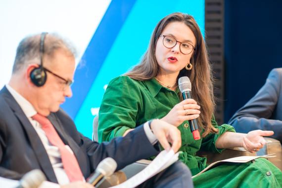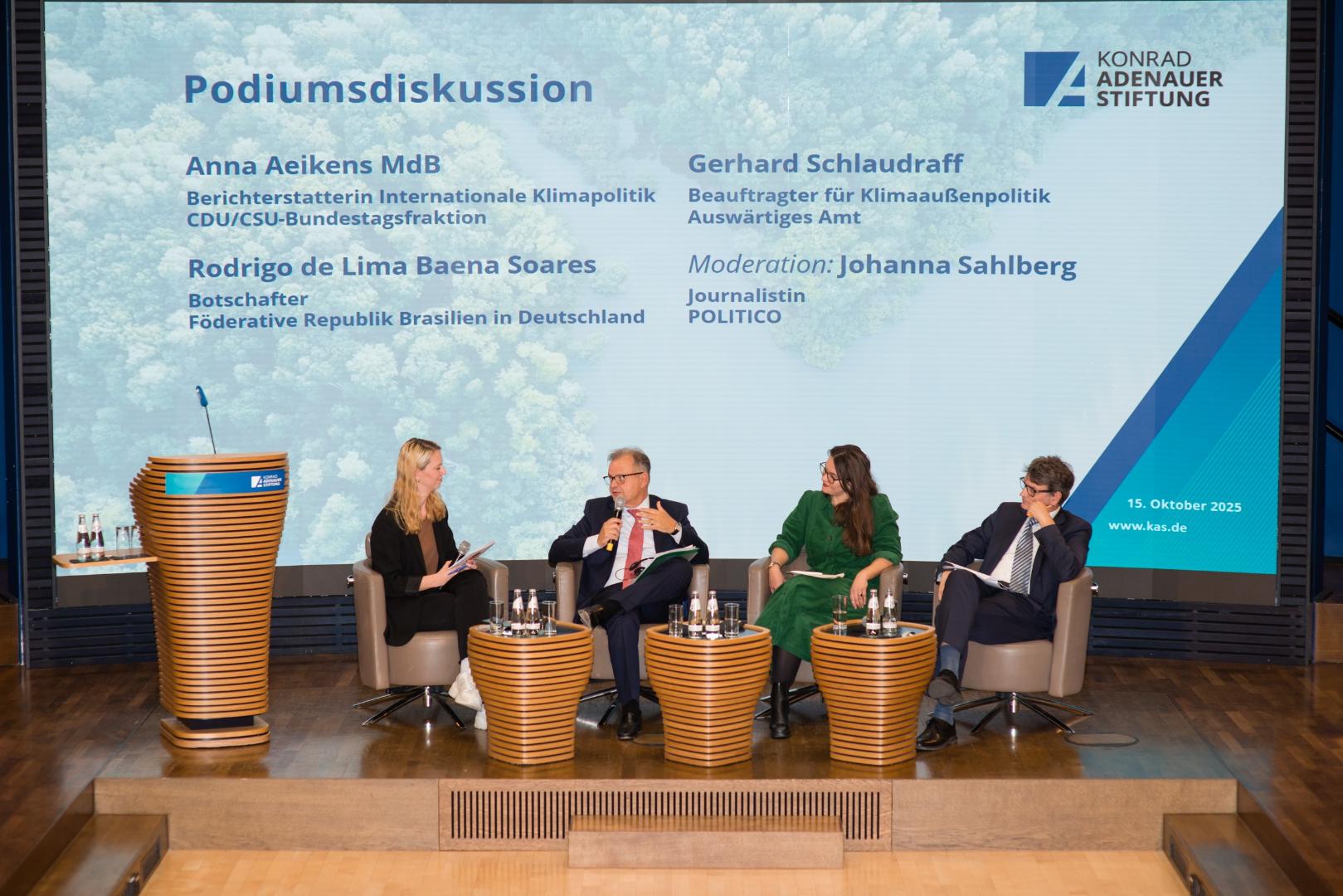 In der anschließenden, von Johanna Sahlberg (Politico) moderierten Diskussion wurde zunächst der Blick auf die oft betonte Vorreiterrolle Europas im Klimaschutz gerichtet und die Frage gestellt, ob diese Rolle noch besteht, obwohl die EU noch um ein verbindliches Klimaziel für 2040 ringt, das als Grundlage für die NDCs (Nationally Determined Contributions) für 2035 dienen soll. Gerhard Schlaudraff (Auswärtiges Amt) und Anna Aeikens MdB forderten, dass Europa sachlich und ambitioniert auftreten und in der Kommunikation über Klimaschutz die Chancen verdeutlichen müsse, um bei der COP30 eine Führungsrolle einzunehmen. Die Diskussion um internationale Zertifikate und deren Qualität wurde als Chance für innovative Kooperationen gewertet. Hinsichtlich der Rolle Deutschlands in der EU hoben sie das Bekenntnis im Koalitionsvertrag zu den Klimazielen hervor. Dass es innen- und wirtschaftspolitische Diskussionen über den besten Weg zu deren Erreichung gebe, bedeute nicht ein Abrücken von den Zielen selbst. Aus Fehlern in der Klimapolitik müsse man ebenso wie aus Fehlern in der Wirtschaftspolitik lernen.