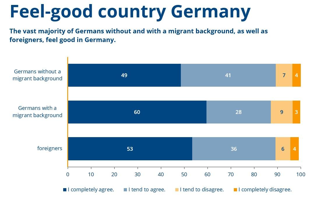 A vast majority of people in Germany say they feel good in Germany. 90 per cent of Germans without a migrant background, 88 per cent of Germans with a migrant background and 89 per cent of foreigners completely agree or tend to agree with the statement 'I feel good in Germany'. Looking only at the proportion of those who 'completely agree', Germans with a migrant background (60 per cent) feel slightly more comfortable than foreigners (53 per cent) or Germans without a migrant background (49 per cent).
