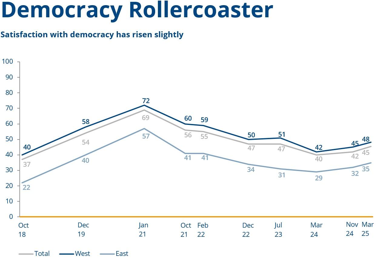 People in eastern Germany are less satisfied with Germany’s democracy than people in western part. In March 2025, 48 per cent of West Germans are satisfied, but only 35 per cent of East Germans. However, at 13 percentage points, the gap is slightly smaller than previously. Between October 2018 and July 2023, the gap ranged mostly between 18 and 20 percentage points.