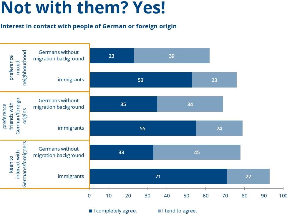 The integration of immigrants and locals depends on mutual contact. The willingness to engage is widespread. For 23 per cent of Germans without migration background, it is very important to live in an area where people with foreign origins live, and for a further 39 per cent, it is important. Even more are interested in having friends with foreign origins.