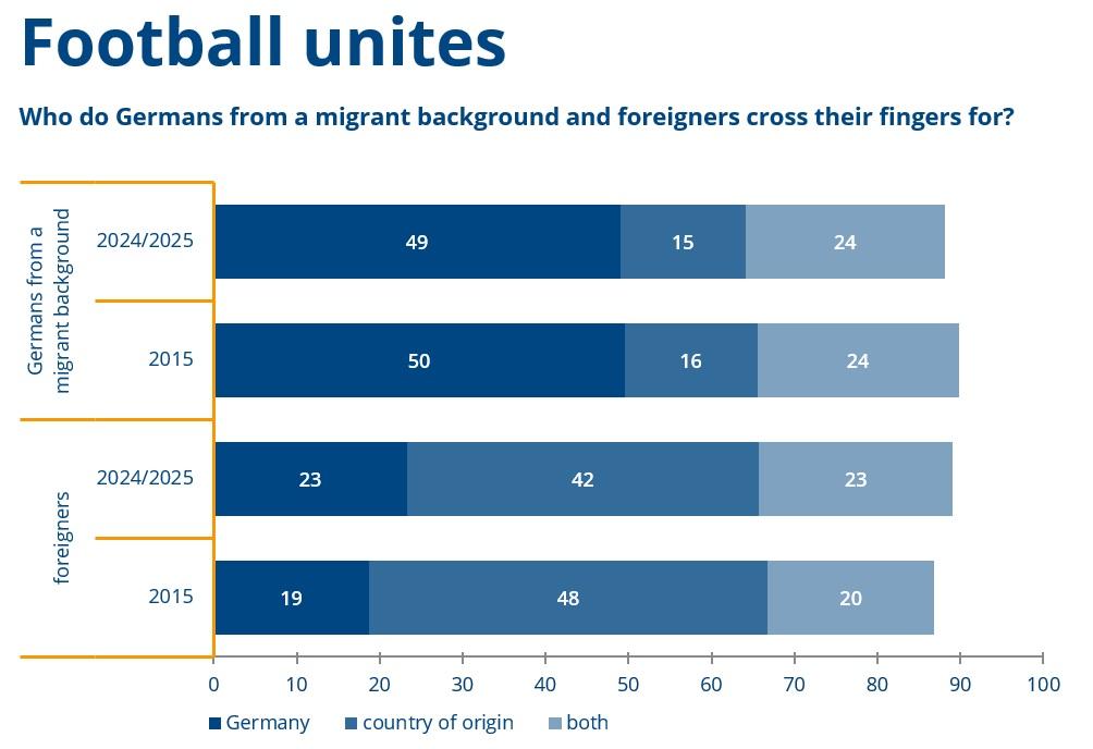 Identification with Germany can manifest itself in various ways, including football. German citizenship makes a significant difference to whether people would support their country of origin (or that of their parents) or Germany in football. Germans from a migrant background are much more likely to cheer for Germany than people without German citizenship.