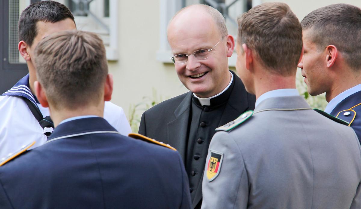 Der katholische Militärbischof Dr. Franz-Josef Overbeck im Gespräch mit Bundeswehrsoldaten. | © KS / Doreen Bierdel