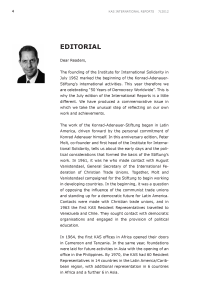 We will be celebrating "50 Years of Democracy Worldwide" in July this year. This is why the July edition of the International Reports is a littledifferent. We have produced a commemorative issue in which we take the unusual step of reflecting on our own work and achievements. Today we have more than 80 offices around the globe. We work tirelessly to make a lasting contribution to peace, freedom and democracy – a contribution that is always based on creating a partnership of equals.