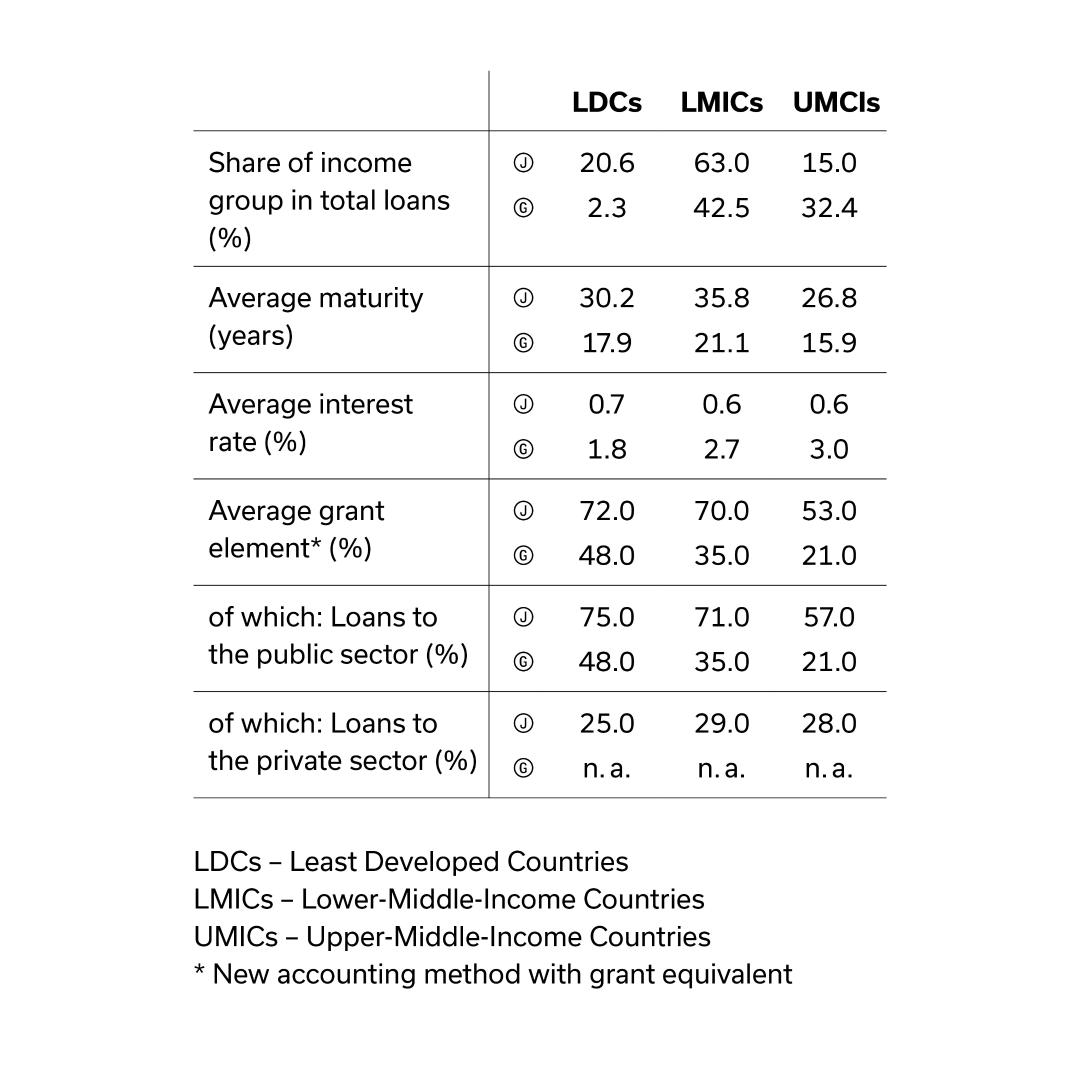 Fig. 2: Characteristics of 2022 ODA loans by income group for Japan (J) and Germany (G) (weighted averages)