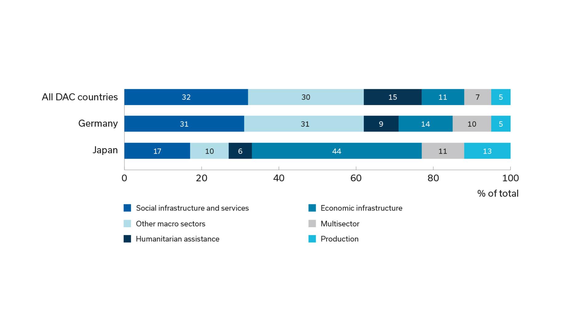Another notable feature is the large share of Japan’s ODA that was allocated to economic infrastructure projects (see figure 4). This sector is far less prominent in the ODA profiles of Germany and the DAC average. Japan also placed greater emphasis on the productive sector, which accounted for around 13 per cent of its bilateral ODA – a higher proportion than in Germany or among DAC countries overall.