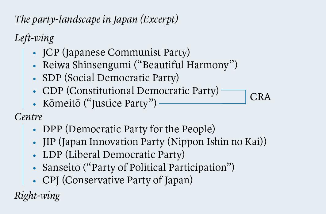 If Japan’s best-known parties were arranged from far left to far right and a line were drawn through the middle of the party landscape, the Japanese Communist Party (JCP), Reiwa Shinsengumi (“Beautiful Harmony”), the Social Democratic Party (SDP), and the Constitutional Democratic Party (CDP) would fall to the left of this line, while Kōmeitō (“Justice Party”) would mark the centre-left and the Democratic Party for the People (DPP) the centre-right. Further to the right would follow the Japan Innovation Party (Nippon Ishin no Kai; JIP), the Liberal Democratic Party (LDP), and Sanseitō (“Party of Political Participation”). On the far right of this scale would be the Conservative Party of Japan (CPJ). However, the CDP and Kōmeitō are now only represented as independent parties in the upper house (Sangiin, or House of Councillors); in the lower house (Shūgiin, or House of Representatives), they merged in January to form the Centrist Reform Alliance (CRA).