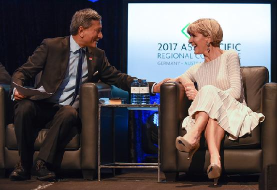 No conference on trade relations in the Asia Pacific would be complete without addressing the geostrategic forces shaping this region. KAS Australia and Pacific was privileged to be hosting an important panel discussion on this topic. Titled “Geopolitics in the Asia Pacific: Opportunities, Challenges and Perspectives”, this session brought together the Foreign Ministers of Australia and Singapore, the Hon. Julie Bishop MP and the Hon. Dr. Vivian Balakrishnan, political editor David Speers from Sky News as well as a select group of international security experts. Following the ministers’ addresses and moderated by David Speers, Dr. May-Britt Stumbaum, Prof. Dr. Joachim Krause (both from Germany), Prof. Dr. Brahma Chellaney (India) Prof. Gordon Flake (Perth USAsia Centre), Mr Peter Jennings (Australian Strategic Policy Institute) and Mr Paul Kelly from The Australian shared their assessment and geopolitical outlook for the region. Despite identifying clear challenges for the international rules-based order, the panel concluded on an upbeat note, agreeing that the need for increased strategic cooperation between Australia and the EU had never been greater. Minister Bishop's keynote address and perspectives from selected panelists can be found in the attached document.
