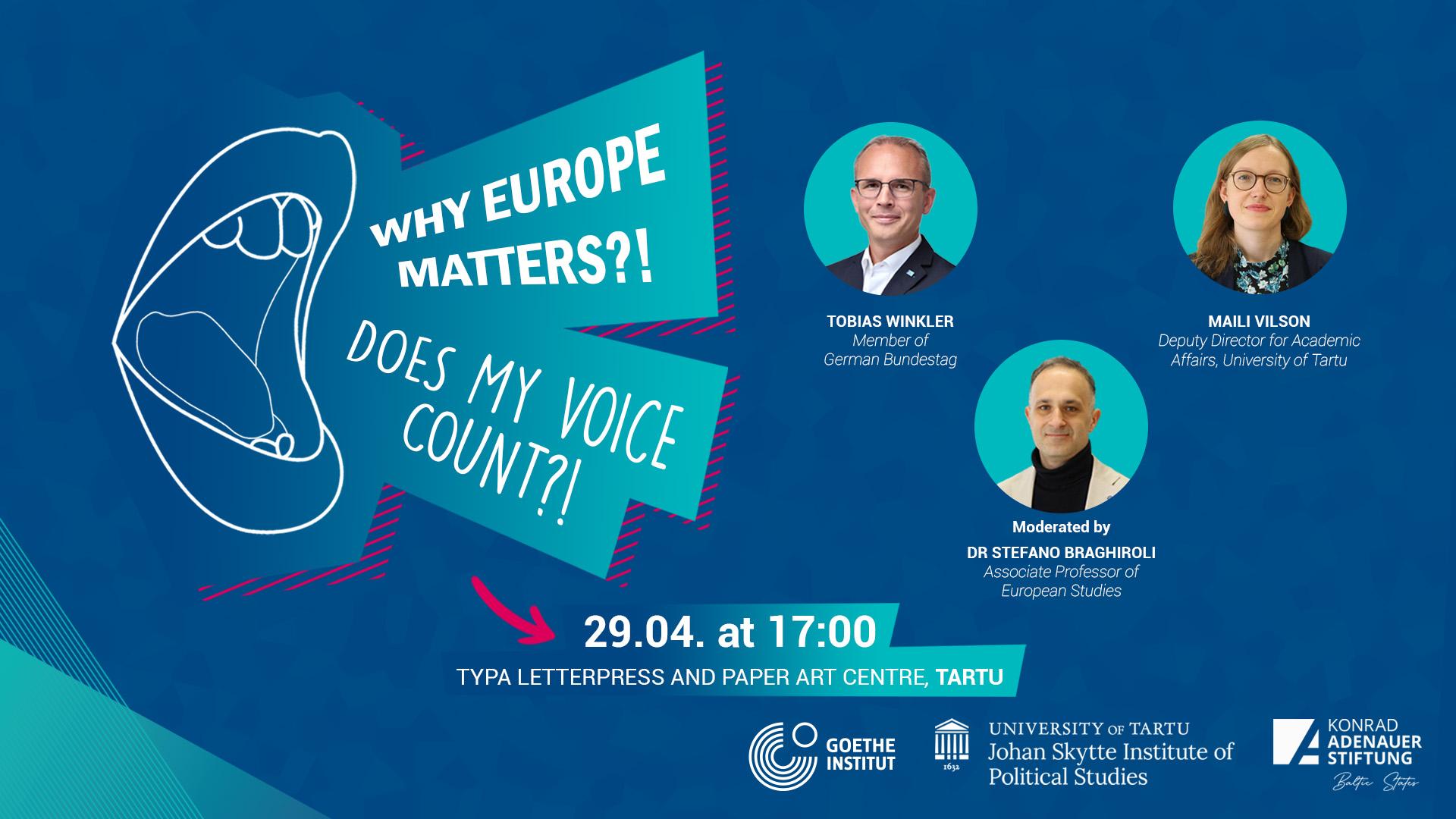The Konrad-Adenauer-Stiftung Baltic States, in cooperation with the Johan Skytte Institute of Political Studies at the University of Tartu and the Goethe Institute, invites you to an exciting discussion: „Why Europe matters? – Does my voice count?“ on April 29th at 5:00 PM at TYPA, Kastani 48f, Tartu.