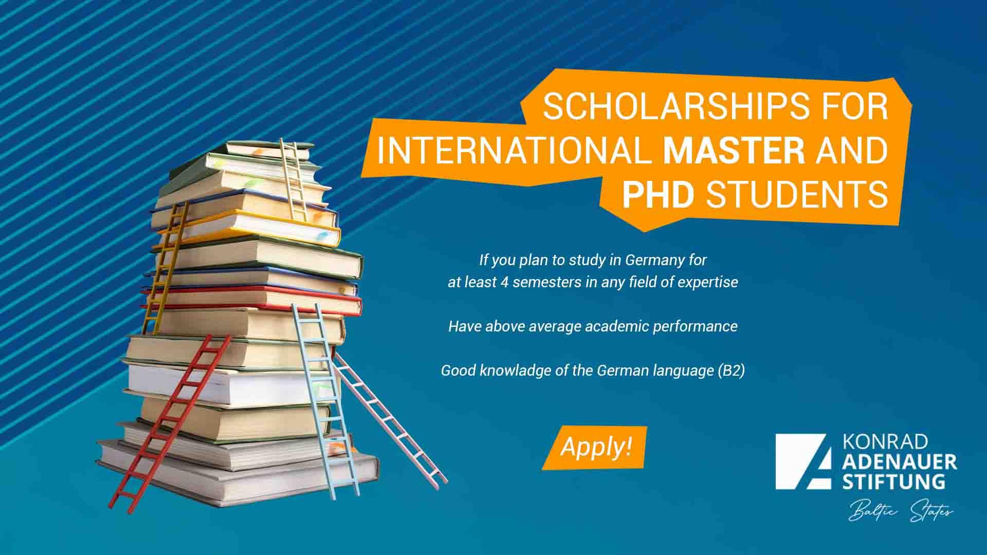 Since 1970 the Konrad-Adenauer-Stiftung awards scholarships to international students from around the world to study and research in Germany. Our scholarship program is aiming at international students and graduates who have acquired a university degree and who intend to complete postgraduate or master studies, doctoral studies or a research stay of at least four semesters at a university in Germany.