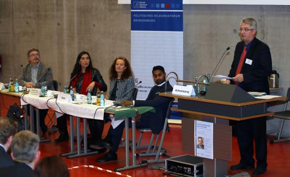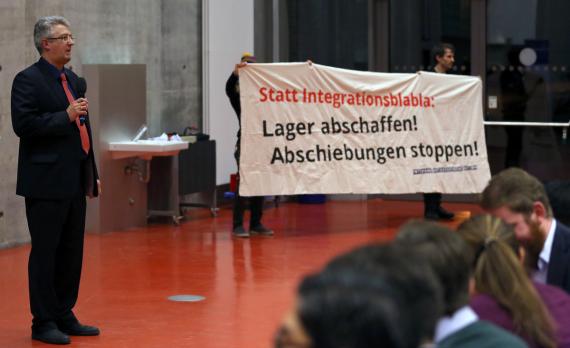 Ein Dialog war zunächst nicht möglich. Als Joshua Acheampong, der Vorsitzende des Mitveranstalters RCDS Potsdam, die Gäste begrüßen wollte, störten linke Aktivisten den Veranstaltungsbeginn massiv. Sie riefen Parolen und breiteten ein Banner aus, auf dem sie die deutsche Flüchtlingspolitik kritisierten. Der Leiter des Politischen Bildungsforums Brandenburg der Konrad-Adenauer-Stiftung, Stephan Georg Raabe, schlug mehrmals vor, dass die Störer zwei Vertreter auf das Podium entsenden und mitdiskutieren könnten. Doch darauf ging die Gruppierung gar nicht ein. Stattdessen gab es eine knappe Stunde lang Pfiffe und Sprechchöre. Polizei war vor Ort, doch die Veranstalter entschieden sich dagegen, die Aktivisten hinauszuwerfen. Und so handelte Raabe einen Deal aus, der in die Tat umgesetzt wurde: ein Aktivist ergriff kurz das Wort und danach verließ die Gruppe den Hörsaal.