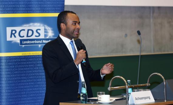 Eigentlich solle durch genau solche Veranstaltungen „ein Zeichen des Dialogs gesetzt werden“, sagte Acheampong nun in seinem Grußwort. Man wolle „zeigen, dass Deutschland weltoffen und friedlich ist.“ Den von der Kommunikationsberaterin Britta Weck moderierten Dialog führten schließlich Flüchtlingspfarrer Bernhard Fricke und Amnesty International Generalsekretärin Selmin Çalışkan. Der RCDS-Bundesvorsitzenden Jenovan Krishnan sprang für Carlo Weber ein, den Leiter der Abteilung Verfassungsschutz des Innenministeriums Brandenburg.