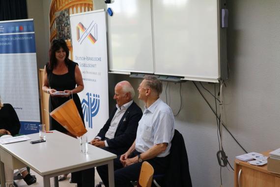 Das Grußwort hielt der Bürgermeister Oranienburgs, Alexander Laesicke, und überreichte Avi Primor am Ende der Veranstaltung zudem eines der letzten Exemplare seines Buches „Mein Weg nach Jerusalem - Mit dem Fahrrad nach Yad Vashem“, das nicht mehr im Handel erhältlich ist, mit einer persönlichen Widmung und dem festen Wunsch nach einer Städtepartnerschaft zwischen Oranienburg und einer israelischen Stadt.