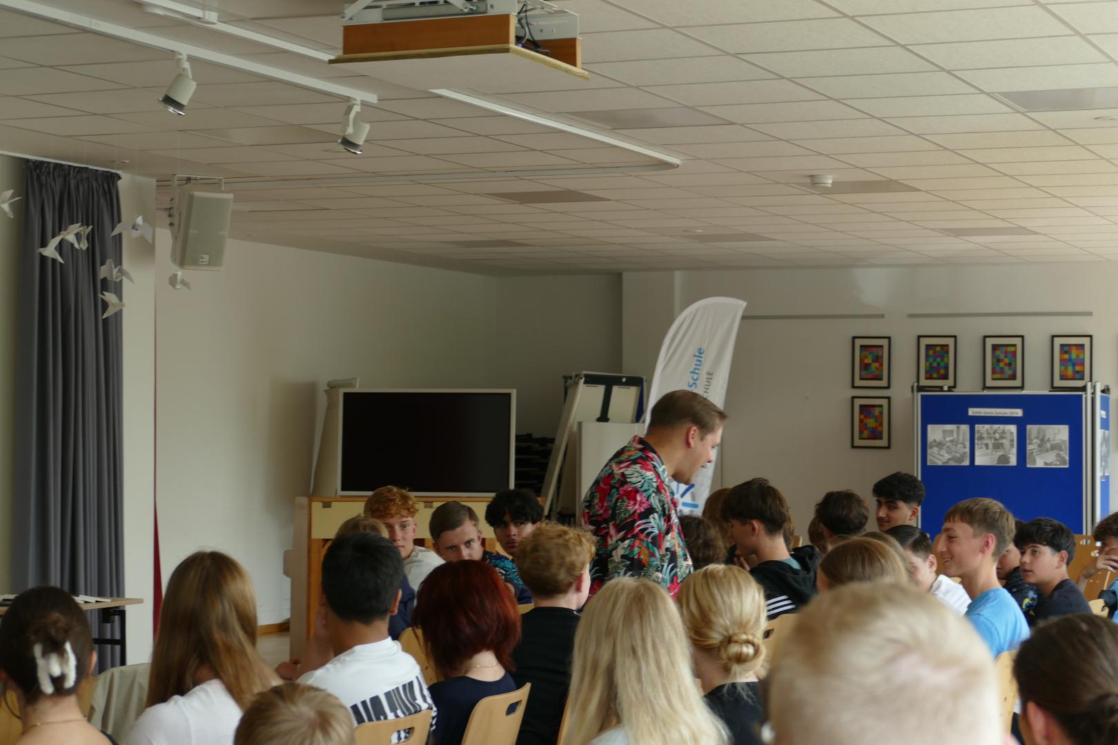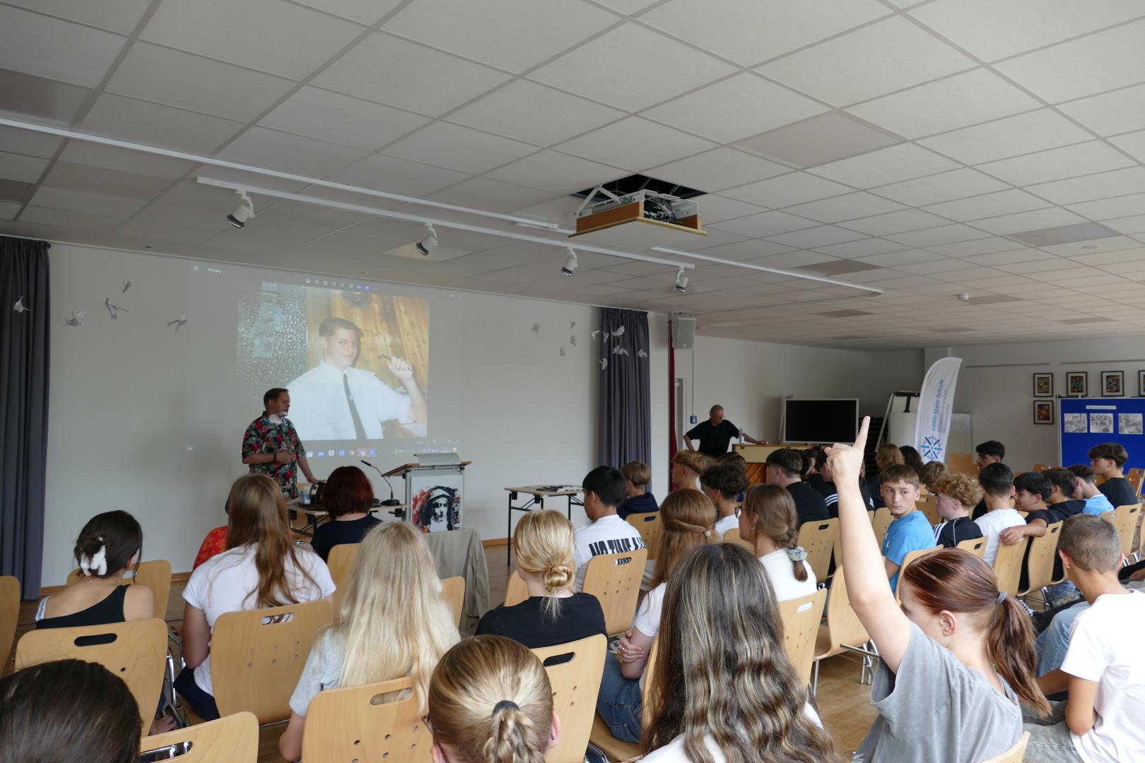 Das Plenum hatte nach einer kurzen Pause die Gelegenheit, Fragen an Reitz zu stellen. Es wurden detaillierte Fragen zu vielfältigen Themen, wie der Gewaltbereitschaft in der Szene und der Beziehung von Reitz zu seiner Familie, aufgeworfen. Reitz ging auf alle Fragen ein und beantwortete diese ausführlich. Zum Abschluss der Fragerunde stellte Reitz den Schülerinnen und Schülern die Frage, ob ihnen der Begriff „Remigration“ bekannt wäre. Der Großteil der anwesenden Klassen gab zu verstehen, dass er nicht wusste, was Remigration bedeute. Anhand von Zahlenbeispielen verdeutlichte Reitz den Anwesenden, wie die Gesellschaft mit einer Remigration aussehen würde und dass diese zu einer starken Veralterung der Gesellschaft führen würde. Die Teilnehmenden waren von dem aufgeführten Beispiel sehr bewegt und verstanden die Auswirkungen, die im Falle der Umsetzung einer Remigration stattfinden würden.