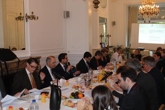 In order to introduce the topic and to kick-off the debate, Dr. Eichert gave a short presentation summing up the major BDI’s findings. Their theses suggest that the recent crisis offers a chance to tackle existing problems with compliance and to discuss how the framework should look like. He evaluated that till this day, there is little evolvement of convergence. The question remains of how to construct convergence for the European Union and how the mechanism should effectively be designed. Dr. Eichert pointed out that there is a danger of instability and spillover effects. Thus, the existing instruments are seen as insufficient. He regards the so-called "three C’s" as current problems: Complexity of the rulebooks, weak compliance with the rules (controllability) and comparability. According to the expert, the national ownership is week. Thus, Dr. Eichert recognized a huge implementation gap, leading to the question of how to construct a framework for the European Monetary Union. He listed six criteria for a successful reform: