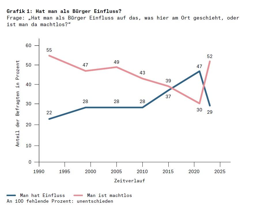 Dennoch ist die These vom allgemeinen Verfall des Vertrauens der Bürger in den Staat und seine Institutionen und Vertreter nicht gänzlich falsch. Im Vergleich zur Situation in Westdeutschland in den 1970er- und 1980er-Jahren lag das Vertrauen in die Institutionen auch vor dem jüngsten Rückschlag auf einem deutlich niedrigeren Niveau.