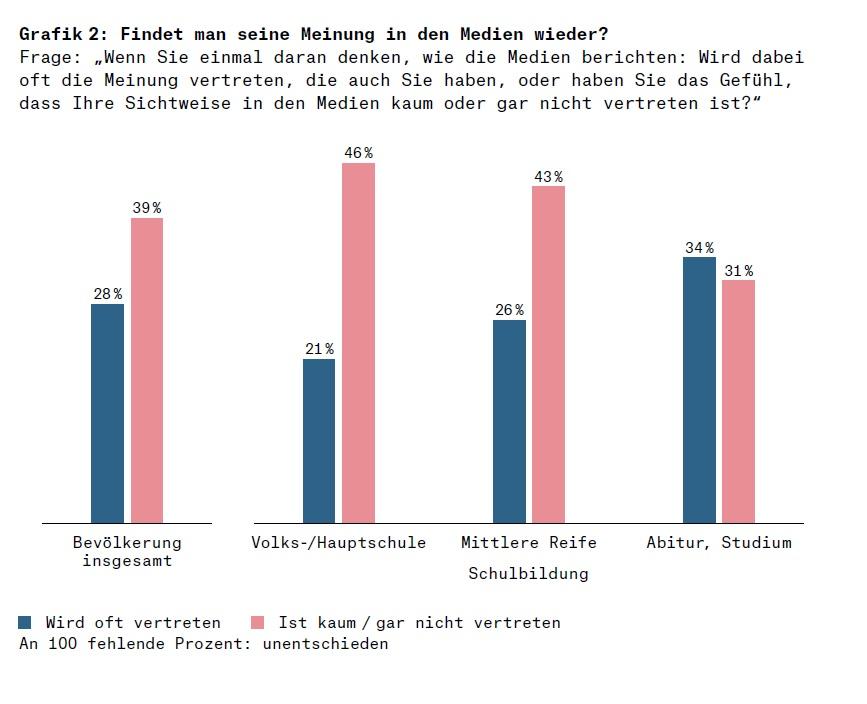 Ein wesentlicher Grund für diesen Vertrauensverlust liegt wahrscheinlich darin, dass sich viele Bürger in der Berichterstattung der Medien nicht mehr wiederfinden. Dies zeigen die Antworten auf die Frage „Wenn Sie einmal daran denken, wie die Medien berichten: Wird dabei oft die Meinung vertreten, die auch Sie haben, oder haben Sie das Gefühl, dass Ihre Sichtweise in den Medien kaum oder gar nicht vertreten ist?“ Nur 28 Prozent der Befragten antworteten 2024 auf diese Frage, sie hätten den Eindruck, dass ihre Meinung oft vertreten wird. Deutlich mehr, 39 Prozent, sagten dagegen, ihre Meinung werde in den Medien kaum oder gar nicht vertreten. Da die öffentlich-rechtlichen Fernsehsender, wie bereits beschrieben, die wichtigste Informationsquelle auf dem Gebiet der Tagespolitik sind, muss man diese Antworten nicht zuletzt als Kommentar auf die Berichterstattung eben dieser Sender deuten. Dabei fällt auf, dass vor allem Befragte mit einfacher und mittlerer Schulbildung das Gefühl haben, ihre Meinung in den Medien nicht wiederzufinden, während dies bei Menschen mit Abitur oder Hochschulabschluss deutlich seltener der Fall ist (siehe Grafik 2).