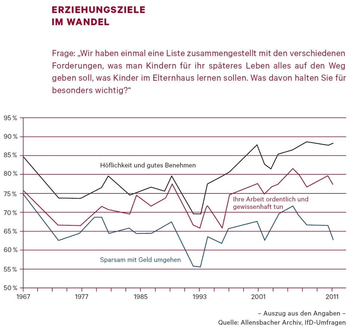 Das ganze Ausmaß der Veränderungen wurde am Institut für Demoskopie Anfang der 1970er-Jahre aufgedeckt. 1967 war in einer Repräsentativumfrage die folgende Frage gestellt worden: „Wir haben eine Liste zusammengestellt mit den verschiedenen Forderungen, was man Kindern für ihr späteres Leben mit auf den Weg geben soll, was Kinder im Elternhaus lernen sollen. Was davon halten Sie für besonders wichtig?“ Auf der Liste standen fünfzehn Erziehungsziele wie Höflichkeit und gutes Benehmen, Sauberkeit, Sparsamkeit, die Arbeit ordentlich und gewissenhaft tun. Die meisten dieser Ziele fanden bei den Befragten großen Zuspruch.