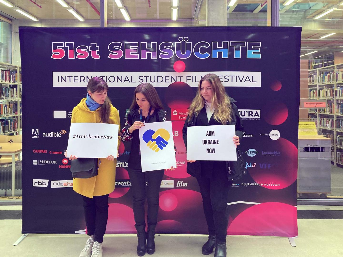 Diese Erfahrung machen Olha und Kateryna nicht erst seit dem 24. Februar. Schon seit 2014 versuchen sie, über den Krieg in der Ostukraine aufzuklären. Einige Tage später besuchen die beiden eine Filmpremiere im Kinosaal der Filmuniversität Babelsberg. Hier findet gerade das 51. International Student Film Festival Sehsüchte statt. Im Rennen um den besten Dokumentarfilm ist auch der Film ihrer Konstipendiatin Iryna. The Bright Path erzählt von Stanislav Aseyev, einem Schriftsteller aus dem Donbas. Von seiner Verschleppung 2017, und was er erlebt hat während seiner 28 Monate währenden Gefangenschaft. Worte wie Willkür, Folter und Konzentrationslager bleiben nach diesem Abend im Gedächtnis. Der Film hatte 2021 Premiere. Als die Moderatorin im Publikumsgespräch erwähnt, der Film sei vor dem Ukraine-Krieg für das Festival ausgewählt worden, korrigiert Regisseurin Iryna sie. „Wir haben seit 2014 Krieg in der Ukraine. Deshalb haben wir diesen Film gemacht.“ Und gemeinsam mit Olha und Kateryna nutzt sie die Gelegenheit, sich für die Bewaffnung der ukrainischen Armee einzusetzen.