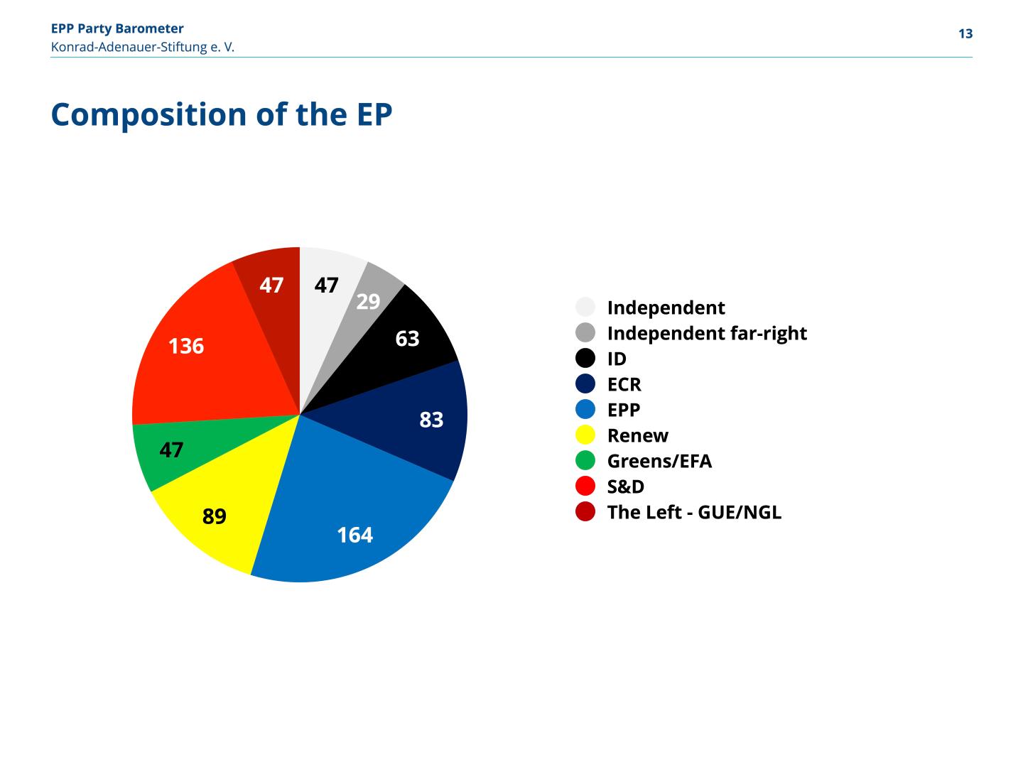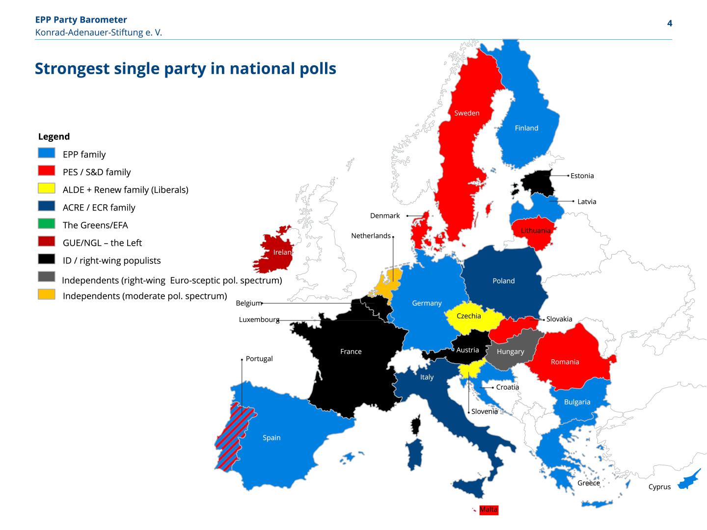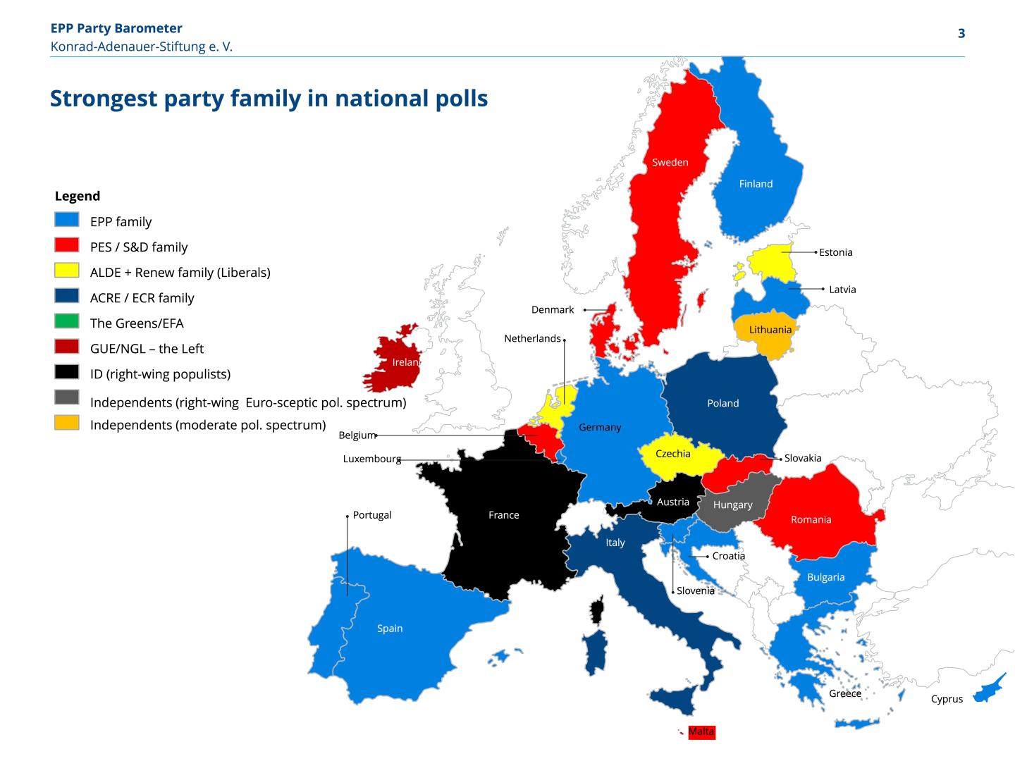 According to polls, the EPP family is the strongest political group in 11 states, the Socialists in 6. The Liberals/Renew are ahead in 3 states, and the Euro-sceptic national conservative ECR and the ID (right wing) in 2. The Left (GUE/NGL) is leading in Ireland. In Hungary, Fidesz was in the lead (not yet part of a party family) and formally independent parties were ahead in Lithuania.