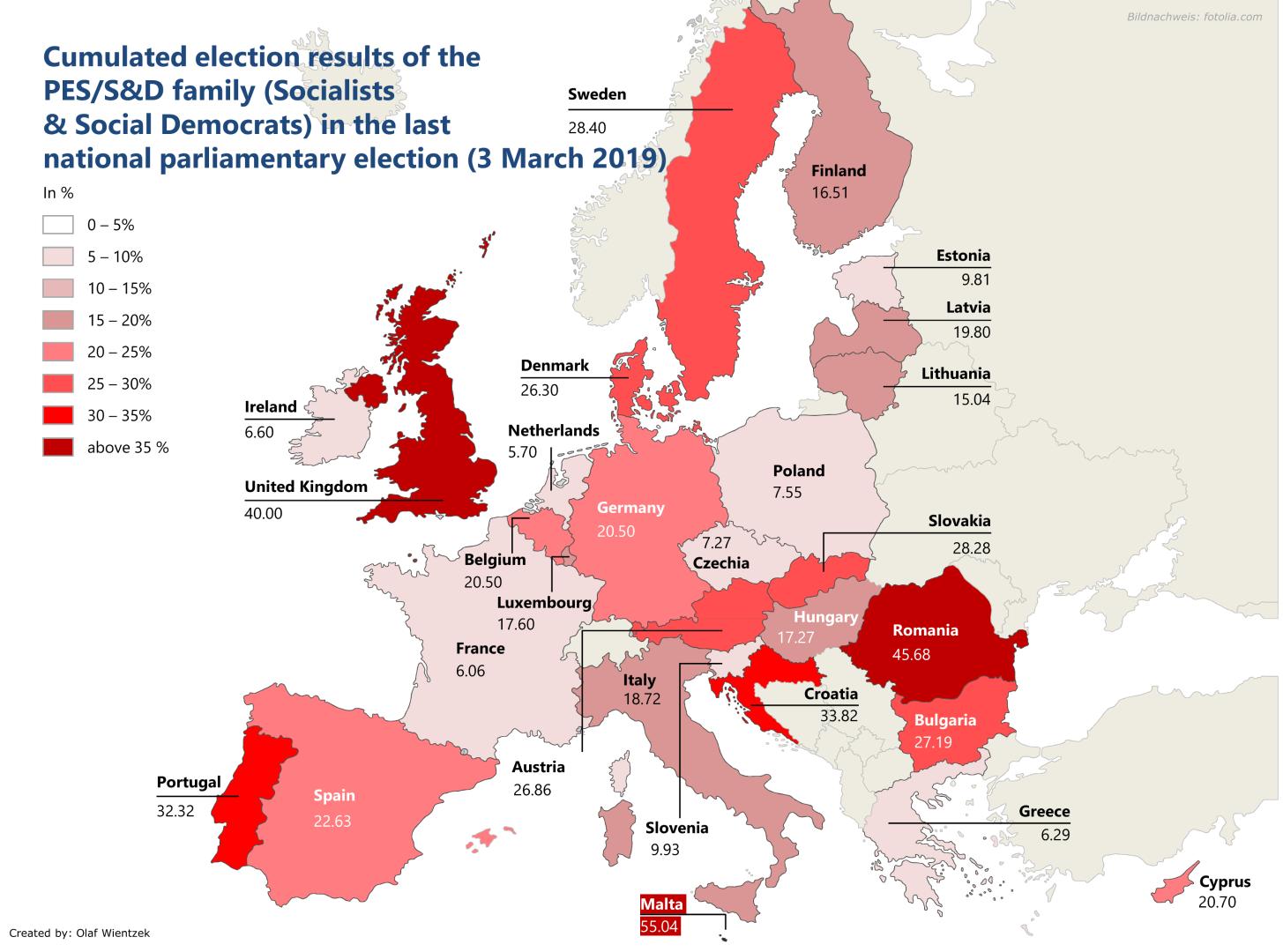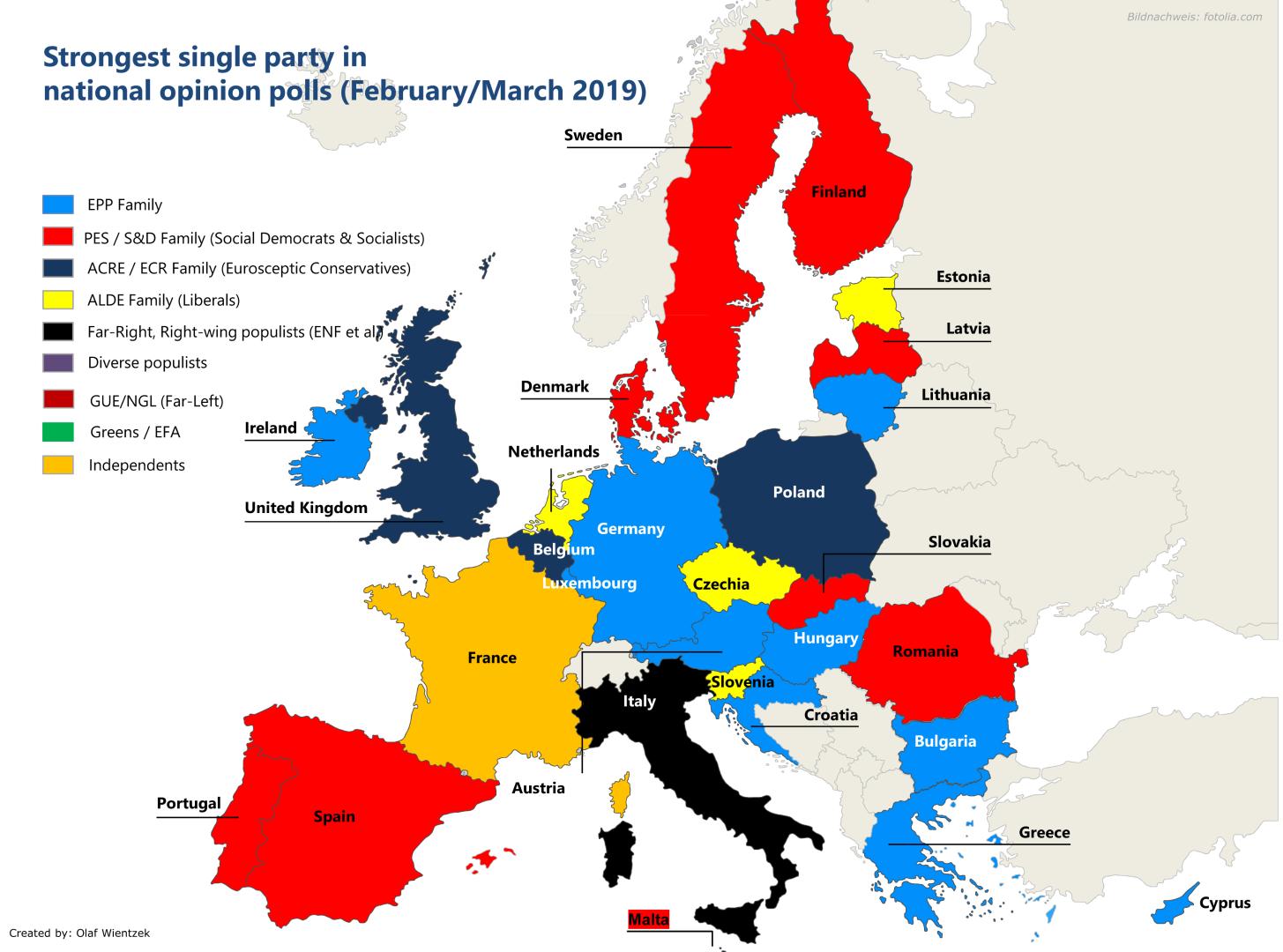 family), an EPP party is leading in 10 countries, the Socialists in 9, the ALDE in 4, the ECR in 3,
