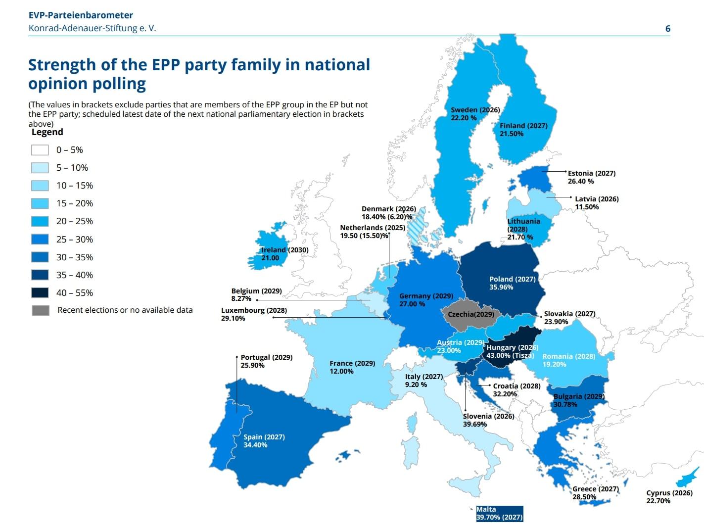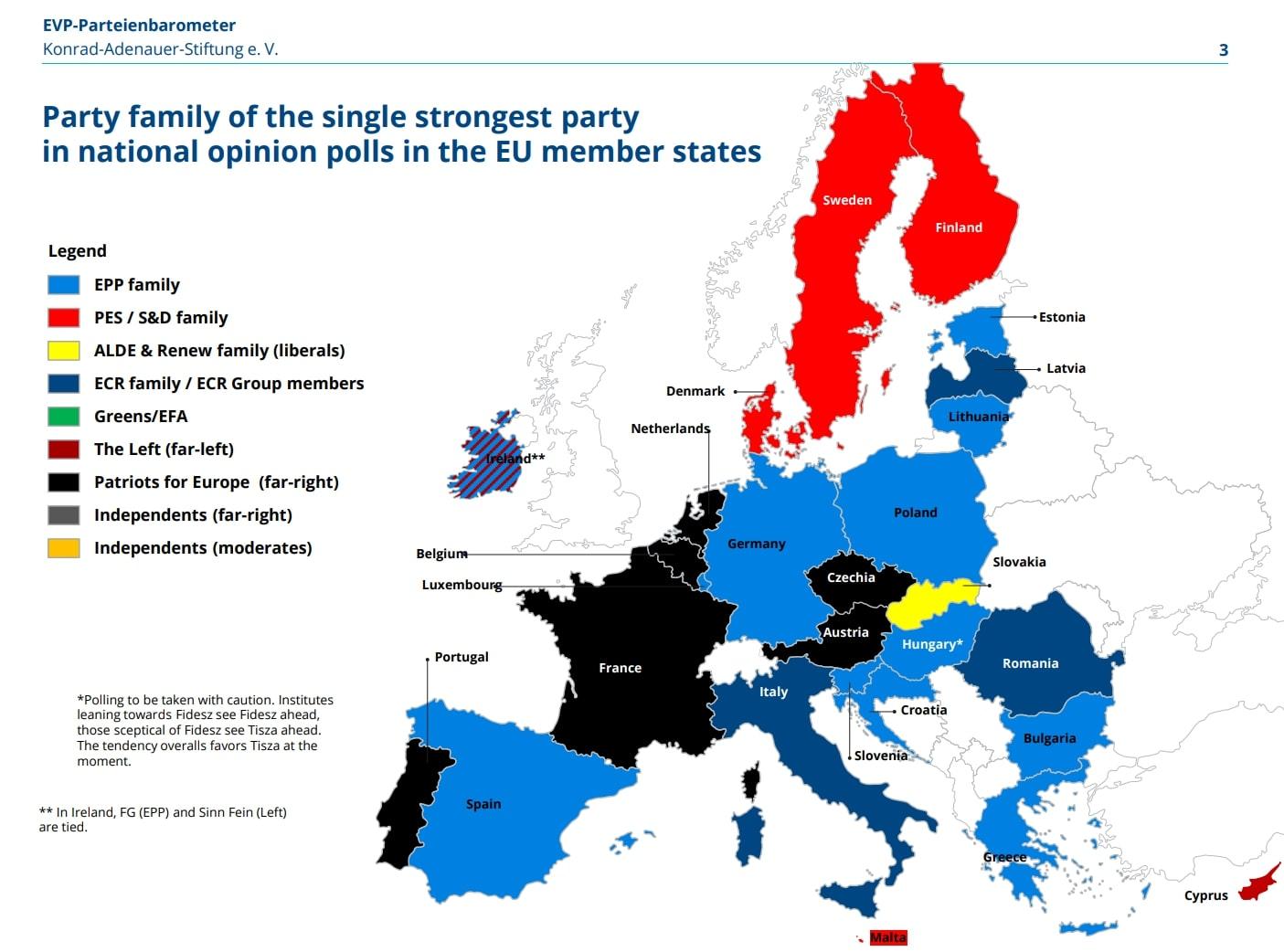 - For the Hungarian parliamentary elections in April 2026, the outlook seems very open. Depending on the affiliation of the polling institute, Fidesz (Patriots for Europe) or Tisza (EPP) are ahead.