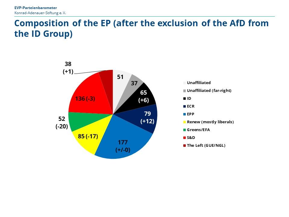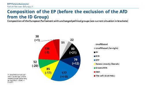 The projection uses EP election forecasts, where available, but otherwise has to rely on national polls and then weight these taking into account factors relevant to EP elections. The difference to the current size of the parliamentary group is shown in brackets (the enlargement of the EP by 15 seats in the next EP must be taken into account).