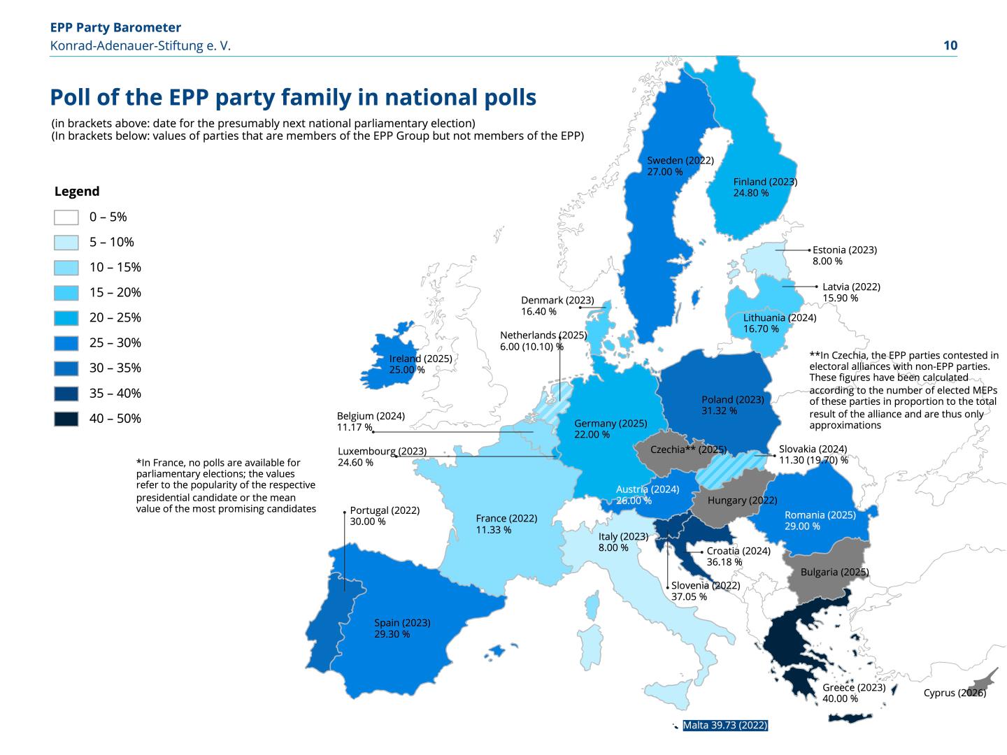 The EPP Party Barometer illustrates the strength of the European party families in current opinion polls - with a particular focus on the European People's Party (EPP).