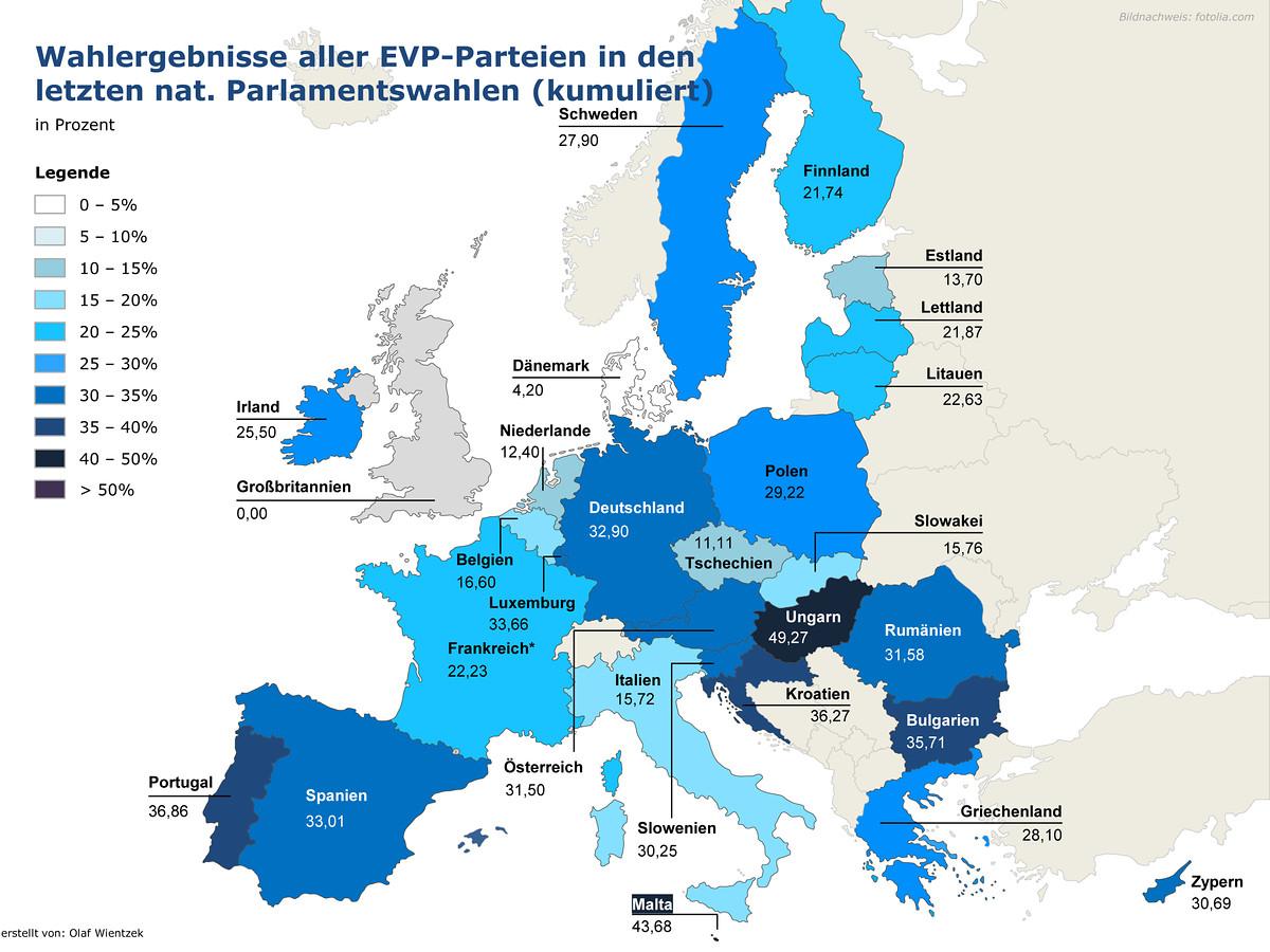 - Die Karten zeigen die Wahlergebnisse und Umfragewerte der Parteien in der EU, die der christdemokratischen-konservativ-bürgerlich geprägten Europäischen Volkspartei (EVP) angehören.
