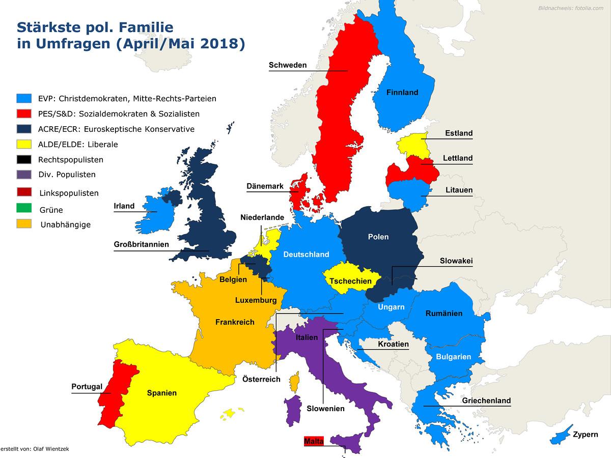 - Die EVP-Familie ist in Umfragen in 13 Ländern (-2 im Vergleich zum letzten Barometer) die stärkste politische Familie, die sozialistische in 5, die eurokritisch-konservative ACRE in 4(+1), die liberale in 4 (+1), Unabhängige 1 (Macron bzw. LREM), Populisten 1 (5-Sterne in Italien). In einigen Ländern ist der Vorsprung der EVP vor anderen politischen Familien sehr knapp (Finnland, Slowenien) in zwei Ländern liegt die EVP-Familie knapp hinter den Sozialisten /den Liberalen (Schweden, Spanien)