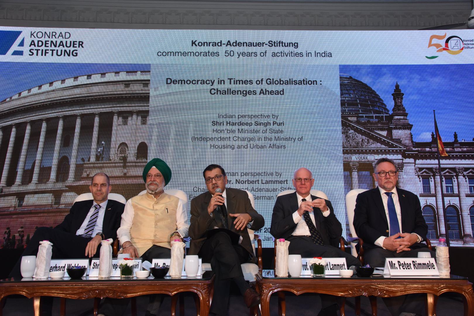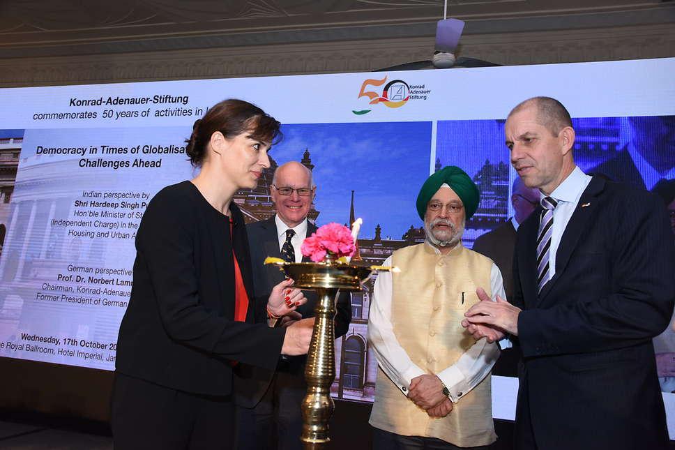 Hardeep Singh Puri ging in seinem Beitrag insbesondere auf die Entwicklungen in Indien in den letzten 50 Jahren ein. Das Land habe sich wirtschaftlich, gesellschaftlich und politisch stark weiterentwickelt, die ambitionierte Stadt- und Infrastrukturentwicklung der Regierung schreite voran und die Demokratie sei in Indien fest verwurzelt. Puri beklagte, dass Indien in der westlichen Welt dennoch in vielen Fällen im öffentlichen Diskurs weiterhin als Land der grassierenden Armut wahrgenommen werde. Die Armutsbekämpfung sei zwar nach wie vor eine große Herausforderung, so Puri, doch Indien befinde sich auf einem guten Entwicklungsweg und habe die Nachhaltigkeitsziele im Blick. Der Staatsminister lobte ausdrücklich die deutsch-indischen Beziehungen als wichtige Partnerschaft und bedankte sich für das Engagement der KAS in Indien.