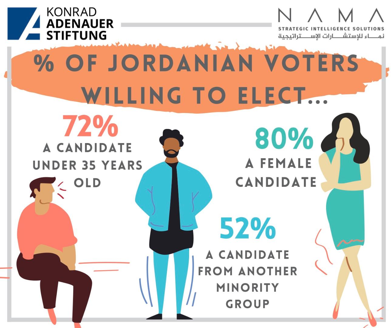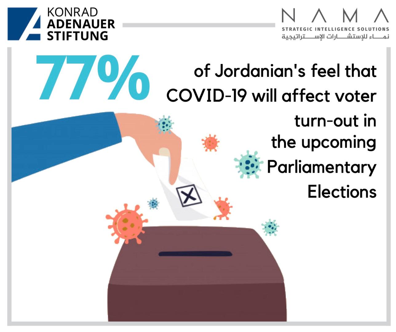 On the 10th of November, Jordan will embark on its 2020 Parliamentary Elections. The November Parliamentary Elections will complete the parliamentary cycle, which is set to be the first cycle to complete four years since the start of the past decade. In light of the current conditions, which play an influential role in both the elections and the events leading up to that, including candidates’ campaigns, NAMA Strategic Intelligence Solutions has conducted a nationally representative survey, in collaboration with Konrad-Adenauer-Stiftung, to explore Jordanians’ perceptions towards the elections. The survey was conducted during the month of September, with an overall sample of 3,003 adult Jordanians, utilizing the survey tool designed by KAS and NAMA, cooperatively. The survey was comprised of 6 main sections: participation, political money, electoral knowledge, voting behavior, personal opinions, and media.
