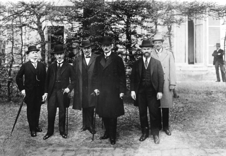 Der Versailler Vertrag wurde im Mai/ Juni 1919 im gleichnamigen Pariser Vorort zwischen den Siegern und dem besiegten Deutschland verhandelt und unterzeichnet. Am 7. Mai legten die Siegermächte, vertreten durch den Präsidenten der USA, Woodrow Wilson, und die Ministerpräsidenten von Großbritannien, Frankreich und Italien – Georges Clemenceau, David Lloyd George bzw. Vittorio Emanuele Orlando – zusammen mit den Vertretern der übrigen Kriegsgegner Deutschlands der deutschen Friedensdelegation unter Leitung des damaligen Außenministers Ulrich Graf Brockdorff-Rantzau im Hotel Trianon Palace einen Vertragsentwurf vor. Dieser durfte, unter Ausschluss von mündlichen Verhandlungen, nur in einem schriftlichen Notenaustausch erörtert werden. Das umfangreiche Vertragswerk war seit dem Zusammentreten der Pariser Präliminarfriedens Konferenz am 18. Januar 1919 in fast drei Monate umfassenden Geheimverhandlungen zwischen den vier Hauptsiegermächten fertiggestellt worden.