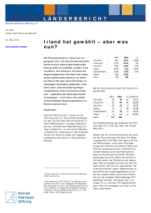 Die Parlamentswahl in Irland vom vergangenen 26.2. hat das sich abzeichnende Szenario einer schwierigen Regierungsbildung nicht nur bestätigt, sondern noch verschärft. Den schweren Verlusten der Regierungsparteien Fine Gael und Labour stehen substantielle Gewinne vor allem bei Fianna Fail aber auch zahlreicher unabhängiger Kandidaten gegenüber. Fest steht somit, dass die bisherige Regierungskoalition keine Fortsetzung findet und – angesichts der bisherigen Koalitionsaussagen – auch kaum eine stabile mehrheitsfähige Regierungskoalition zu Stande kommen wird.
