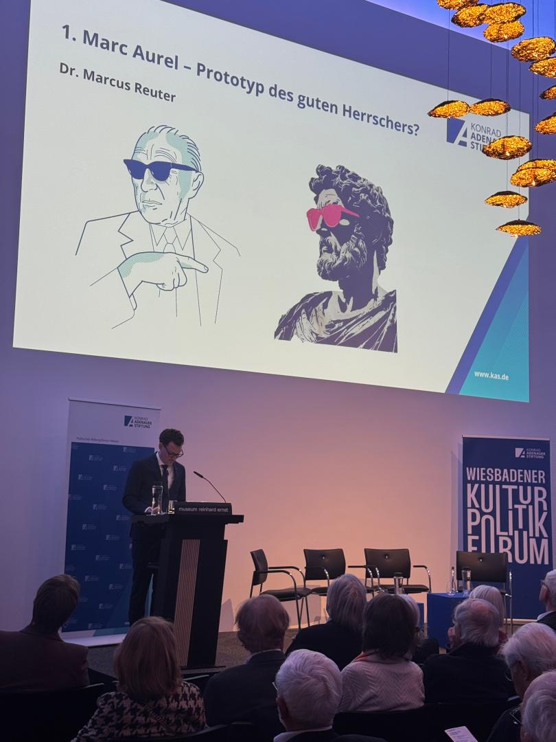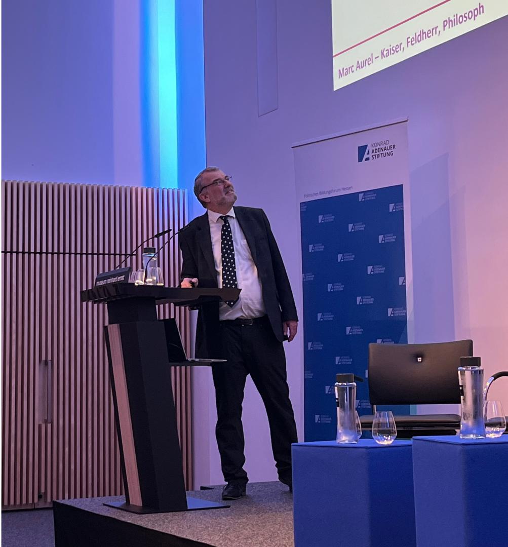 Den ersten inhaltlichen Impuls gab Dr. Marcus Reuter, der den römischen Kaiser Marc Aurel als mögliche Leitfigur guter Herrschaft vorstellte. Zu dessen Zeit habe sich das Imperium auf dem Höhepunkt seiner Macht befunden. Reuter erläuterte, dass Marc Aurel im System des Adoptivkaisertums aufgewachsen und über Jahrzehnte hinweg auf sein Amt vorbereitet sei. Seine Regierungszeit sei geprägt gewesen von enormen Herausforderungen (hier dränge sich ein Vergleich zu heute auf, auch wenn die Strukturen damals selbstverständlich gänzlich andere gewesen seien): Schulden, Kriege, eine schwere Pestepidemie und frühe Völkerwanderungsbewegungen. Marc Aurel habe, so Reuter, mit pragmatischem Krisenmanagement reagiert und sei selbst stets sehr präsent gewesen. Seine privaten Notizen, die Selbstbetrachtungen, seien hingegen erst im 16. Jahrhundert wiederentdeckt worden und hätten zu seinem späteren Bild als „Philosophenkaiser“ geführt – eine Zuschreibung, die in der römischen Antike so nicht existiert habe. Dort sei von einem Herrscher Härte und militärische Stärke erwartet worden. Zwar sei Marc Aurel philosophisch der Lehre der Stoa gefolgt, die den Dienst an der Allgemeinheit und moralische Selbstprüfung betone, doch hätten diese moralischen Prinzipien trotzdem häufig im Widerspruch zur gesellschaftlichen Realität des Imperiums und den Anforderungen an die Herrschaftsausübung gestanden. Dennoch sei er als ein „Glücksfall in Krisenjahren“ zu bezeichnen.