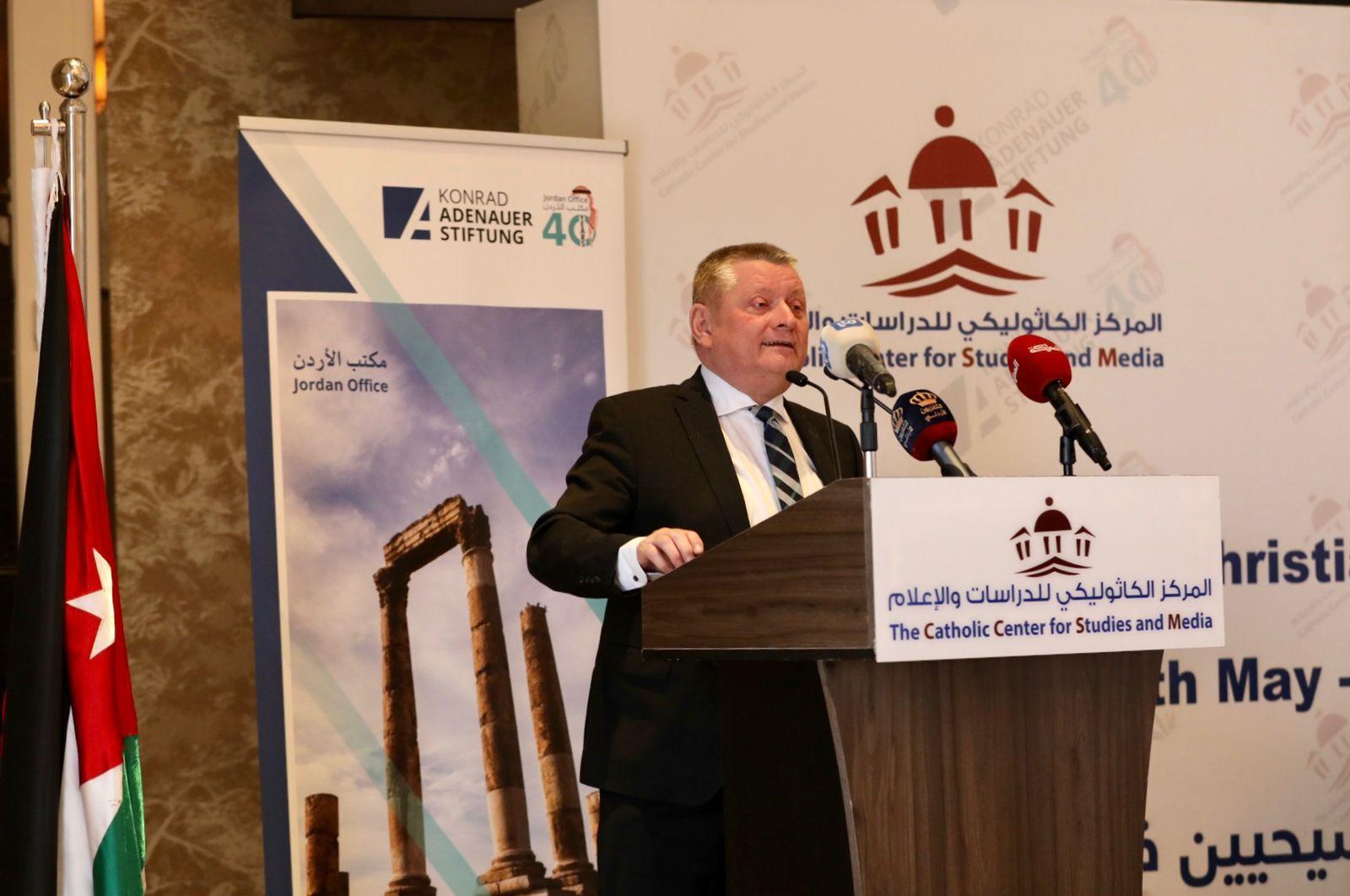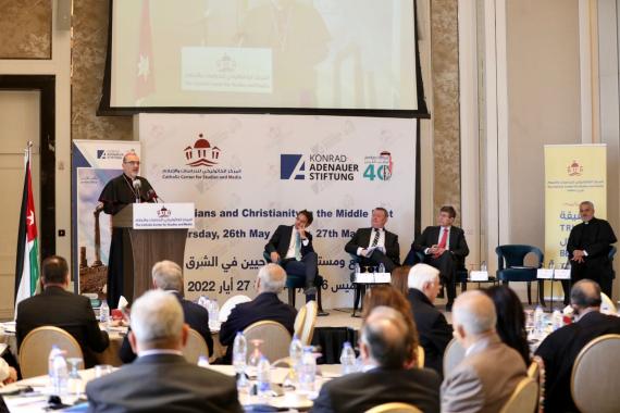 „Die Konrad-Adenauer-Stiftung setzt sich weltweit für Religionsfreiheit als Menschenrecht ein“, betonte der stellvertretende KAS-Vorsitzende in seiner Eröffnungsrede der Konferenz. Das Schicksal der Christen in der Ursprungsregion dreier Weltreligionen sei dabei für die KAS und die Christdemokratie ein besonderes Anliegen. Gröhe sprach die Abwanderung der Christen aus dem Nahen Osten in den letzten Jahrzehnten an und warb für Toleranz, Pluralismus und Minderheitenschutz als elementare Bestandteile erfolgreicher Gesellschaften. An der Konferenz nahmen rund hundert führende Kirchenleute aus der Region teil, darunter der Lateinische Patriarch von Jerusalem, Erzbischof Pizzaballa, sowie christliche und muslimische Vertreterinnen und Vertreter aus Politik, Wissenschaft und Zivilgesellschaft. Bei einer Gesprächsrunde in der christlich geprägten Stadt Madaba, am Fuße des Berg Nebo, diskutierte Gröhe über das Potenzial des religiösen Tourismus für Jordanien, unter anderem mit dem örtlichen Abgeordneten Majdi Yacoub sowie dem ehemaligen Jugendminister Dr. Fares Breizat, der derzeit eine Tourismus-Arbeitsgruppe am Königshof leitet. Gröhe unterstrich dabei die Bedeutung der grenzüberschreitenden Zusammenarbeit, um den Tourismus in Jordanien zu stärken.