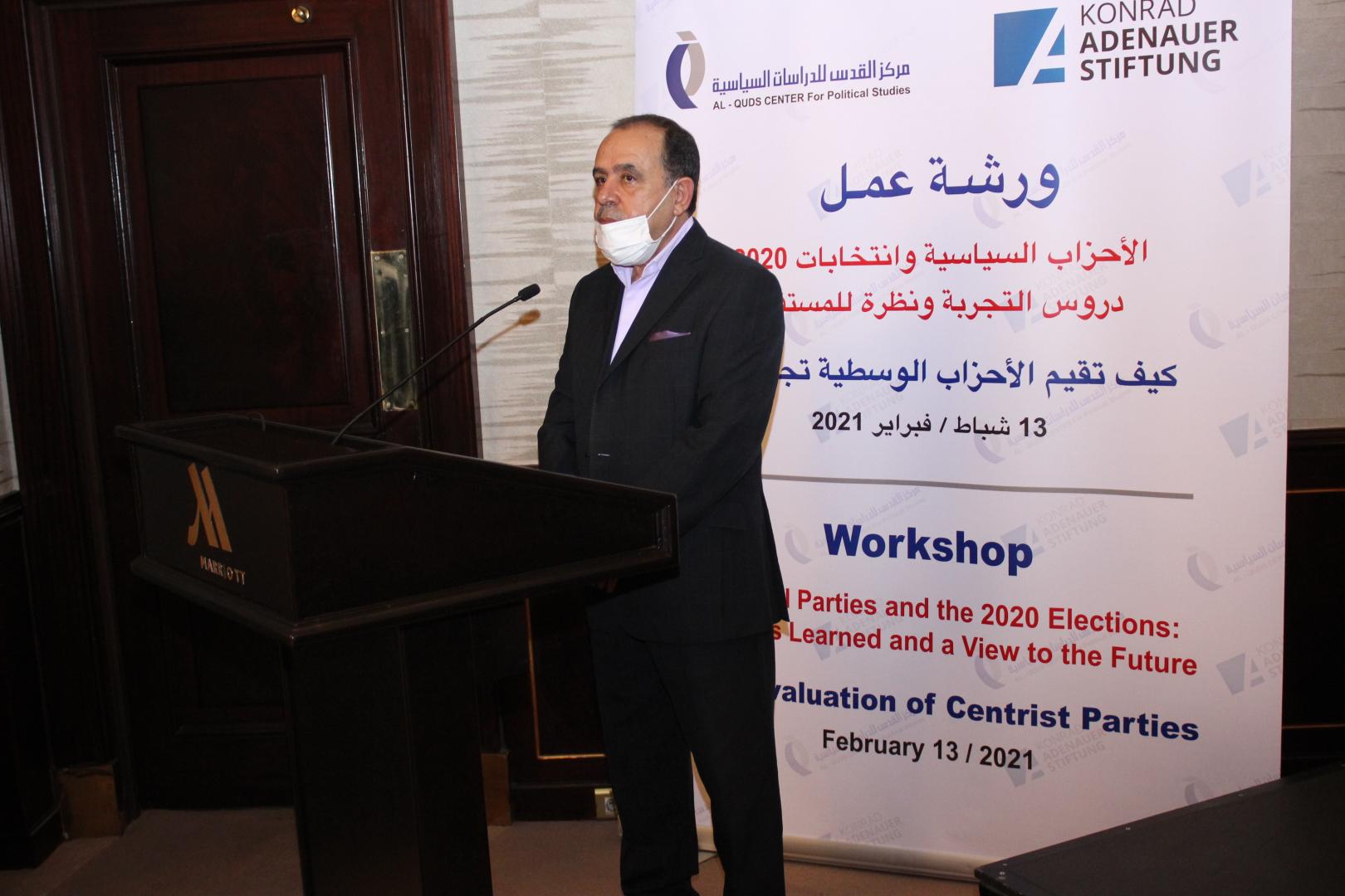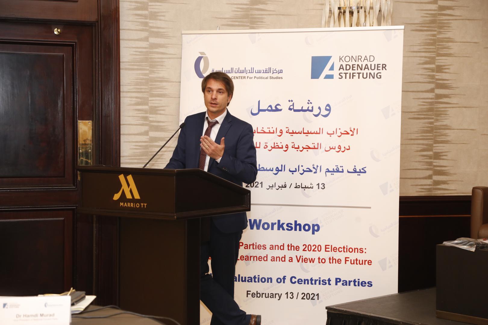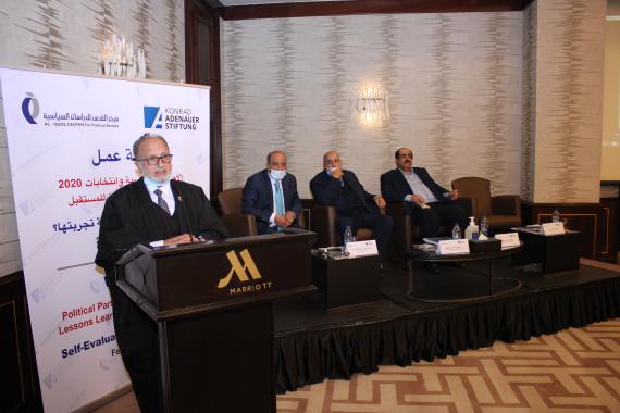 The first workshop under the project “Political Party Capacity Building” took place last Saturday, 13th February 2021. Jointly organized with Al Quds Center for Political Studies, this workshop brought together centrist parties to transparently review their results and performance in the 2020 parliamentary elections. In his opening speech, Dr. Edmund Ratka, Resident Representative of the Konrad-Adenauer-Stiftung in Jordan, reiterated the commitment of the Foundation to an inclusive political process, where political parties have their role to play. The secretary generals of the Resala (“Message”) Party and the National Loyalty Party, H.E. Dr. Hazem Kashoua and H.E. Mr. Mazin Al-Qadi respectively as well as the Vice President of the National Movement Party, H.E. Dr. Hamdi Murad, were invited as speakers to share their parties’ election experience in the workshop. The three speakers, along with the workshop’s moderator, H.E. Dr. Akhleif Al-Tarawneh, former President of the University of Jordan, had an open discussion with the workshop’s participants on several important themes including centrist parties’ readiness to run for the 2020 elections; how the election lists were formed; the fairness with which parties chose their running candidates and how the election campaigns were funded. The workshop also gave the opportunity for centrist parties to examine how their own internal conditions impacted the results of the 2020 elections.
