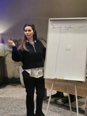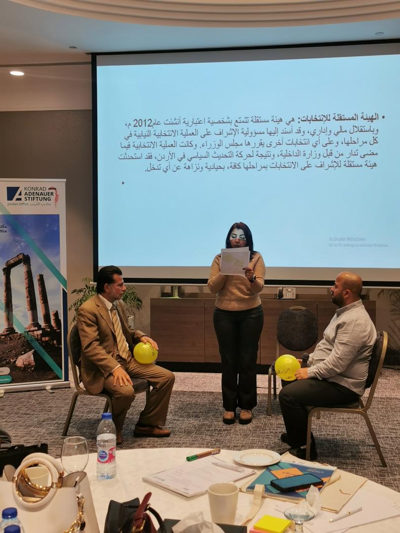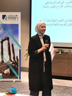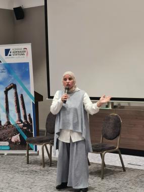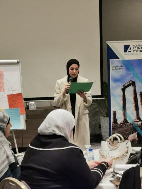 During her welcoming remarks at the first Training of Teachers workshop, Veronika Ertl, Resident Representative of the Konrad Adenauer Foundation in Jordan, thanked long-standing KAS partner, JCCE director Mona Al Alami, for her commitment to education. She also thanked the participating teachers for their crucial role in helping students become active citizens. On the second day, Dr. Asma Al Sharab, Head of the Humanities Department at the Curriculum Administration (MoE), and Social Studies Curriculum Development Coordinator at the NCCD, answered the participants’ questions about the revised social studies curriculum and committed to work on solving any problems they presented regarding the revised textbooks.
