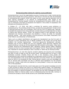 In October 6th - 8th 2020, KAS held a workshop for aspiring young politicians on entrepreneurship. The workshop aimed at firstly, provoke the young politicians’ minds to think of starting/improving their own businesses, which will be a form of creating jobs. Secondly, to broaden the scope and have more politicians consider taking up entrepreneurship as means to finance their political careers. Thirdly, the measure aimed to have politicians who also understand the business environment and therefore in future can lobby for favorable economic policies that would enhance a thriving economy and enable investments from Small Medium size enterprises to Multinationals.