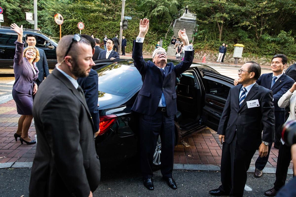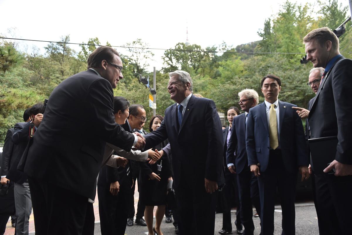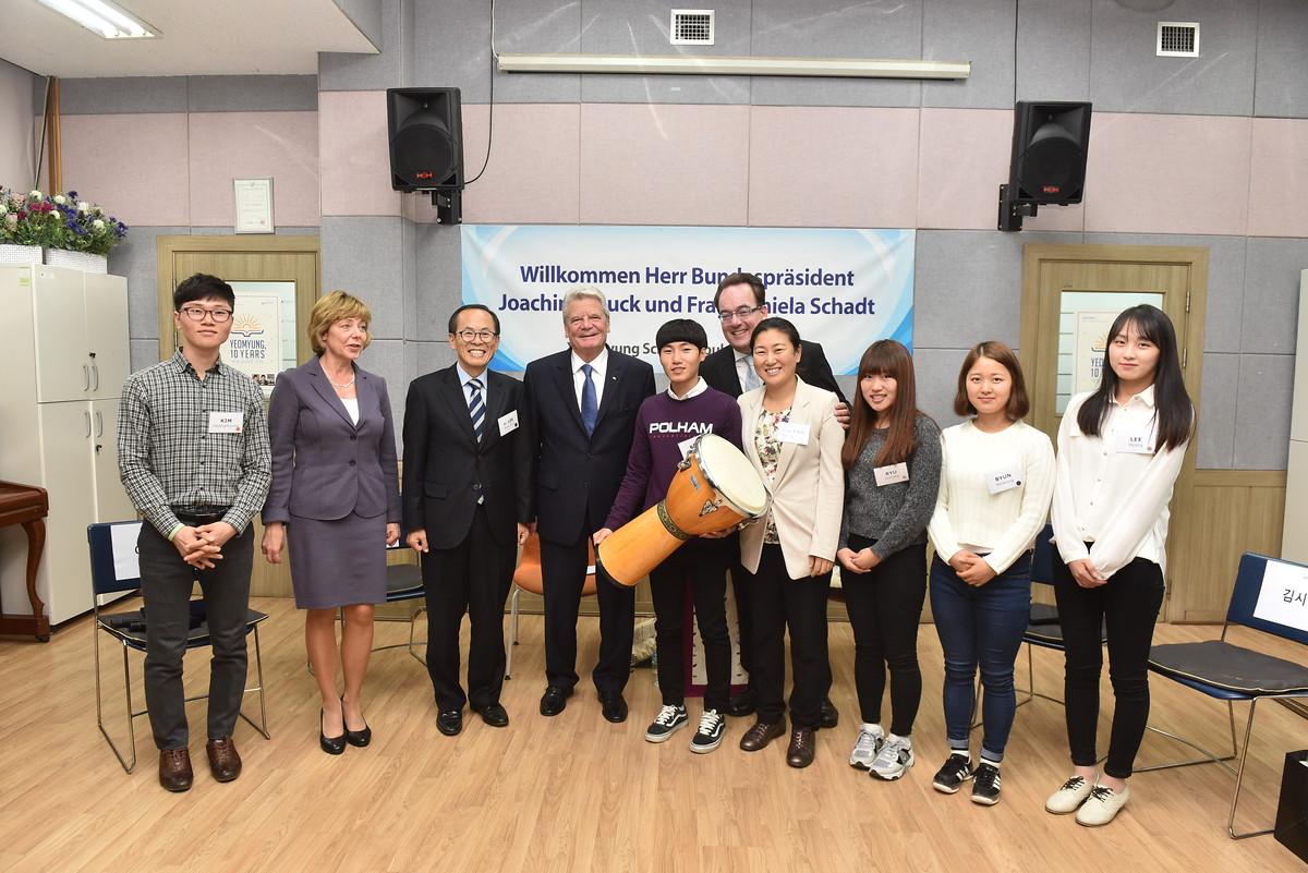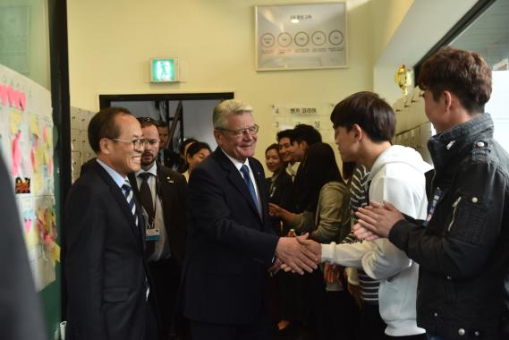 Das deutsche Staatsoberhaupt wurde vor dem Schulgebäude von zahlreichen Schülern begeistert empfangen. Während seines einstündigen Gesprächs traf Gauck neben Vertretern der Lehrerschaft mit einer Gruppe von sieben Schülerinnen und Schülern im Alter von 18 bis 24 Jahren zusammen, die in zum Teil bewegenden Worten von den Erlebnissen ihrer Flucht aus Nordkorea sowie den Problemen bei der Integration in Südkorea erzählten.