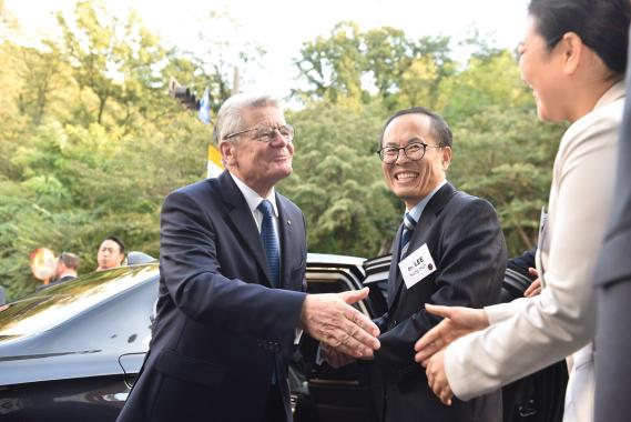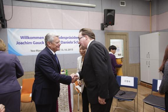 Der Bundespräsident informierte sich eingehend über die Arbeit der Yeo-Myung School und würdigte die gesellschaftliche Integrationsleistung, die die Einrichtung erbringe. „Ich finde es toll, was hier für Arbeit gemacht wird.“, so Gauck. Der Bundespräsident lobte die Yeo-Myung School für ihre Arbeit aus christlicher Gesinnung.